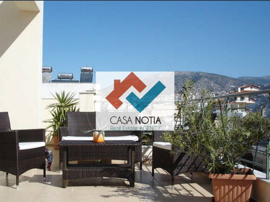 Ρετιρέ με βεράντες 50 τμ με πέργκολα και απεριόριστη θέα βουνό και θάλασσα . Διατίθεται επιπλωμένο και εξοπλισμένο με τις ηλεκτρικές συσκευές ( εκτός του πλυντηρίου ρούχων) .Το ασανσέρ καταλήγει μέσα στο διαμέρισμα