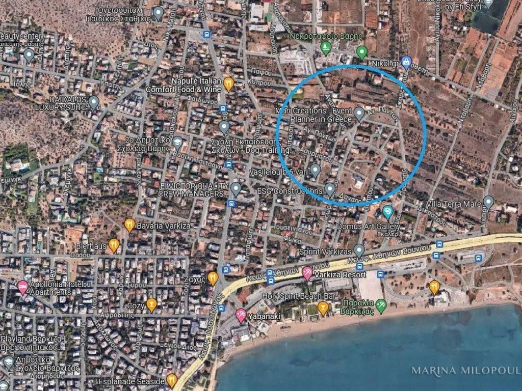 Varκiza, location Asirmatos, only in 800 meters distance from the sea, an excellent corner plot of 500 sqm.quiet neighborhood, open space. Construction rate 0,5 in the first 250sqm, 0,4 for the rest. Zone price 1800€. At a distance of 1 km from the organized "Varkiza Resort" beach, 900 meters from the market of Varkiza and 18 km from the intern. airport.