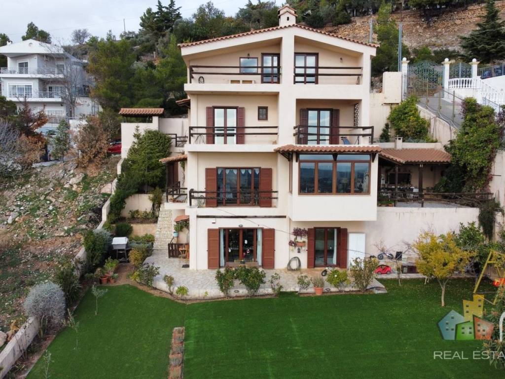 If you dream of the warm atmosphere of a chalet and an exceptional panoramic view, we recommend this comfortable property, sheltered from the wind and enjoying an exceptional panoramic view in the residential area of Drafi! The neighbor of Drafi is renowned for the preservation of the natural environment and is located 30 minutes from Athens, close to international schools and the Attica highway. A few minutes by car from the metro station at Pallini and the MacArthur shopping center. The port of Rafina, the beaches and the airport are 15 minutes away by car. The house built in 2010, on a plot of 700 sqm, it includes two independent dwellings spread over four levels and served by a lift, plus a garden and a large cellar. At the bottom, on the ground floor, a 77sqm apartment consists of a living room, an open small kitchen, one bathroom, a WC, one bedroom and another room without window. The main house of 202 sqm is above the apartment and develops on three levels of approximately 77 sqm each. Living/dining room, with a fitted kitchen open to the living room, a stone fireplace and a balcony with a superb view to the mountains and to the sea. There is also a WC and access to a protected courtyard with the BBQ. On the first, floor two bedrooms with built-in wardrobes, a bathroom, and a storage at the very top under the roof a large master bedroom, with its ensuite bathroom, its dressing room and its balcony. There is also a cellar of 76 sqm in the basement with access from the garden and two parking spaces within the plot with an automatic garage door. Mobilia Real Estate, contact phone: 2107563200, 2107563202, email: info@mobilia.gr, website: www.mobilia.gr