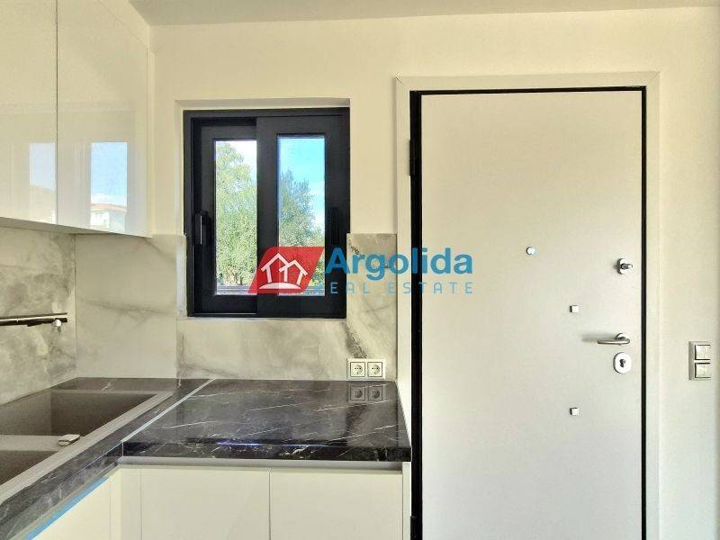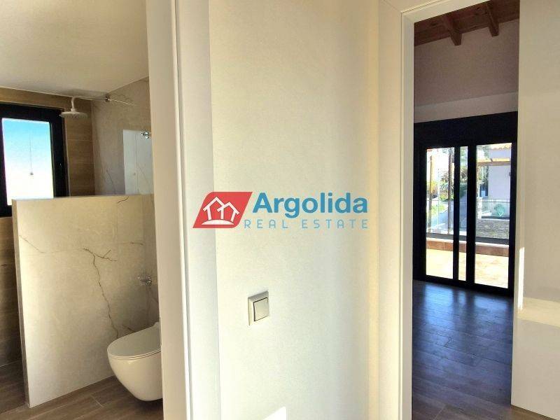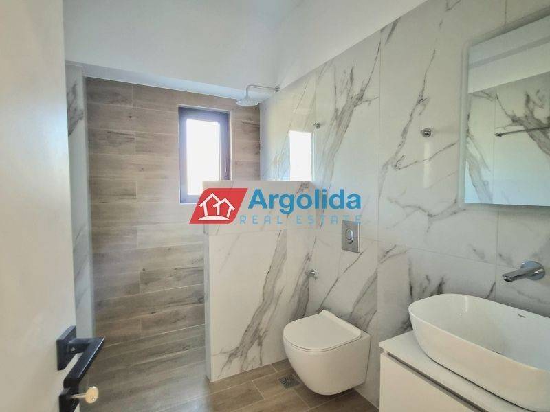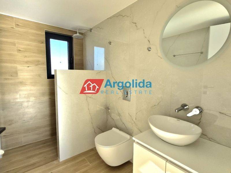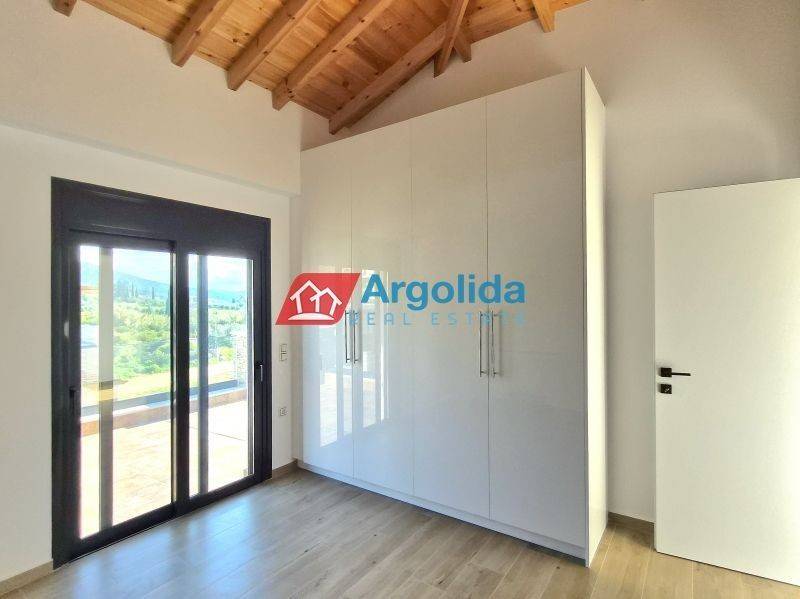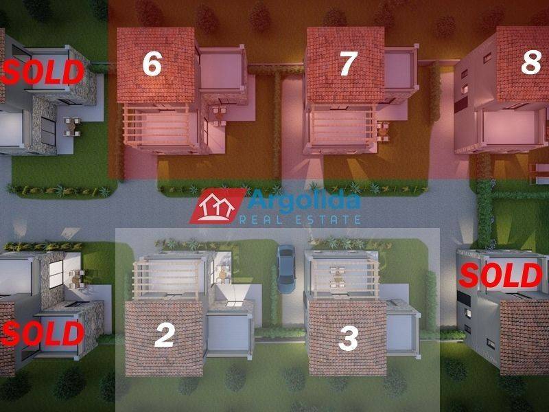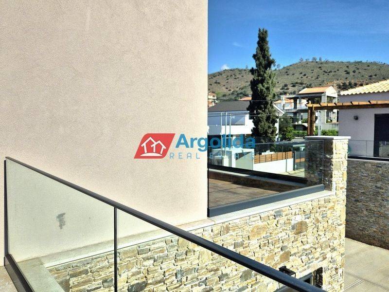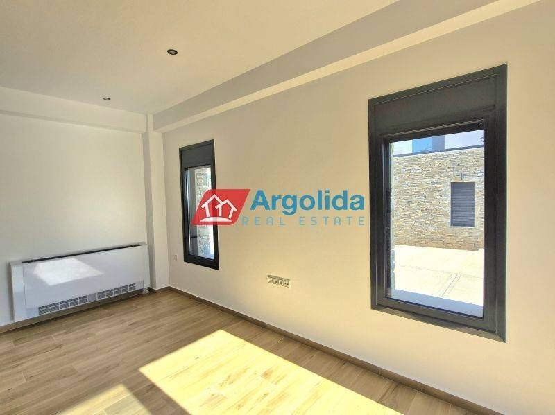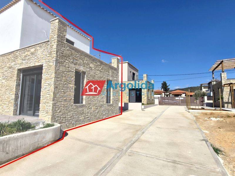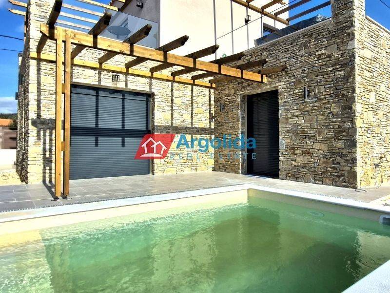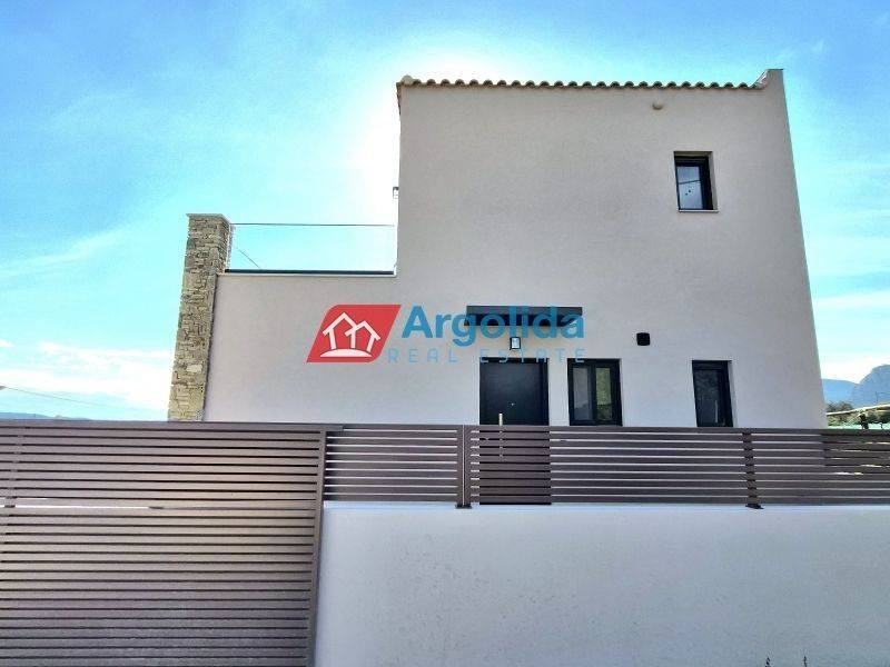 HOME 3 - In a beautiful and fast-developing area close to the historic town of Nafplio, a brand-new detached house of 95 sq.m. is offered for sale, with exclusive use of a 140 sq.m. plot, ideal for permanent or holiday living as well as investment purposes. This modern two-level residence features Energy Class +, combining contemporary design with traditional architectural elements such as a thermal insulation façade and stone finishes inspired by dry-stone craftsmanship. The ground floor includes an open-plan kitchen, living and dining area, one bedroom with fitted wardrobe and one bathroom, while the upper floor offers a spacious master bedroom with fitted wardrobe, en-suite bathroom and access to two large balconies with open views to the natural landscape and partial sea views from a distance. The property is equipped with a heat pump and fan coil units for efficient heating and cooling, energy-efficient aluminum frames with double glazing and thermal break, a solar water heater and a security entrance door, ensuring low energy consumption and high comfort. It also includes an outdoor parking space within the plot for one car, while the small swimming pool of 12 sq.m. shown in the photos is not included in the price and can be constructed at an additional cost. Located in a quiet neighborhood with mainly newly built residences, it enjoys a privileged position just 7 km from Nafplio and approximately 5 km from the beautiful beaches of Tolo and Plaka Drepano, offering easy access to the sea and the city. Houses 2 and 3 are completed and available for immediate delivery, while houses 6, 7 and 8 have an estimated delivery time of about 16 months, making this property a prime opportunity in Argolida.