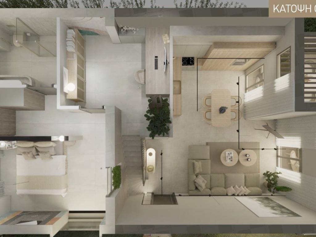 NEA KALLIKRATEIA, Monokatoikia 129 sq.m. in 182 sq.m. plot, painted, ground floor 85 sq.m. ( 2 b/r, living room, bathroom, kitchen ), 1st floor 44 sq.m. ( 1 b/r, living room, bathroom ), penthouse, county house, luxurious, for investment, at residential area, for commercial use, year of construction 2024, 3 b/r, living room, 2 bathrooms, kitchen, office, double-sided, bright, heating n/a, solar panel, air condition, floor heating, with energy class A, with floor type plakaki, with aloyminioy joinery, double glazing, pest net, internal staircase, disabled access, security door, veranda 20 sq.m., garden, storage room, open garage, price 400.000€, code 723