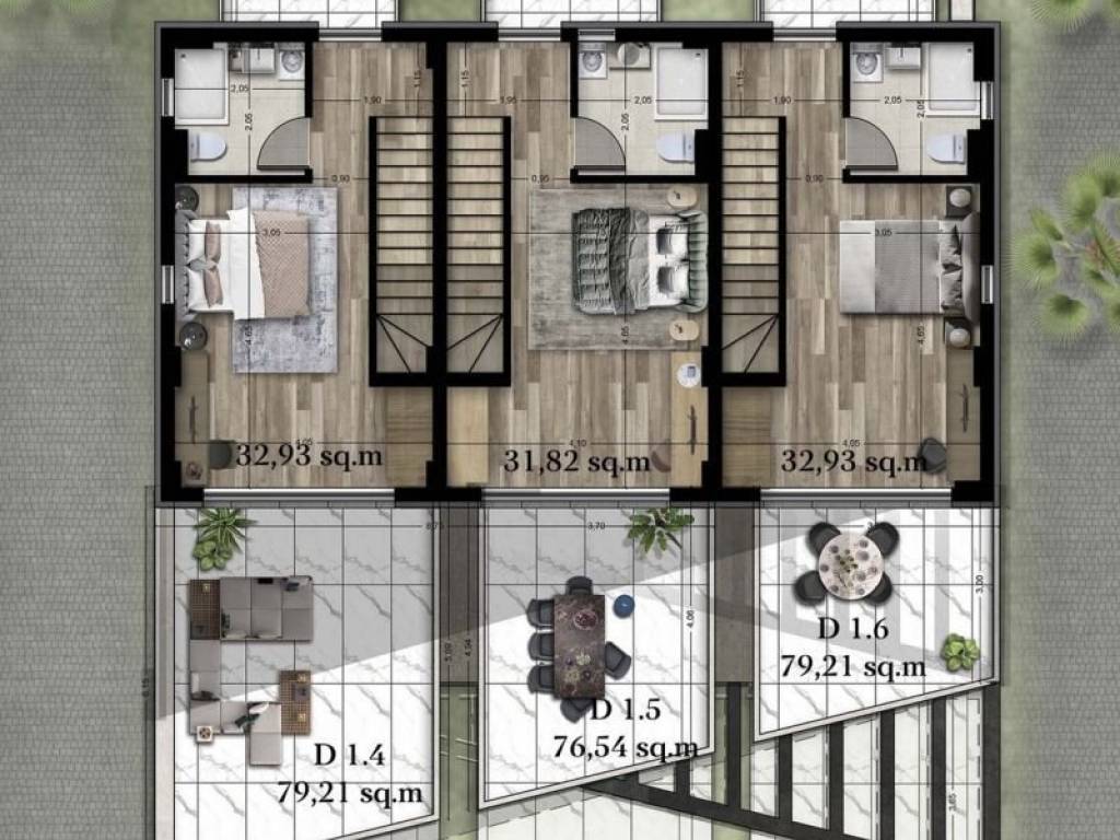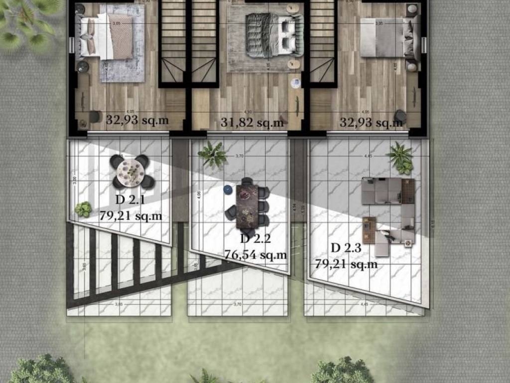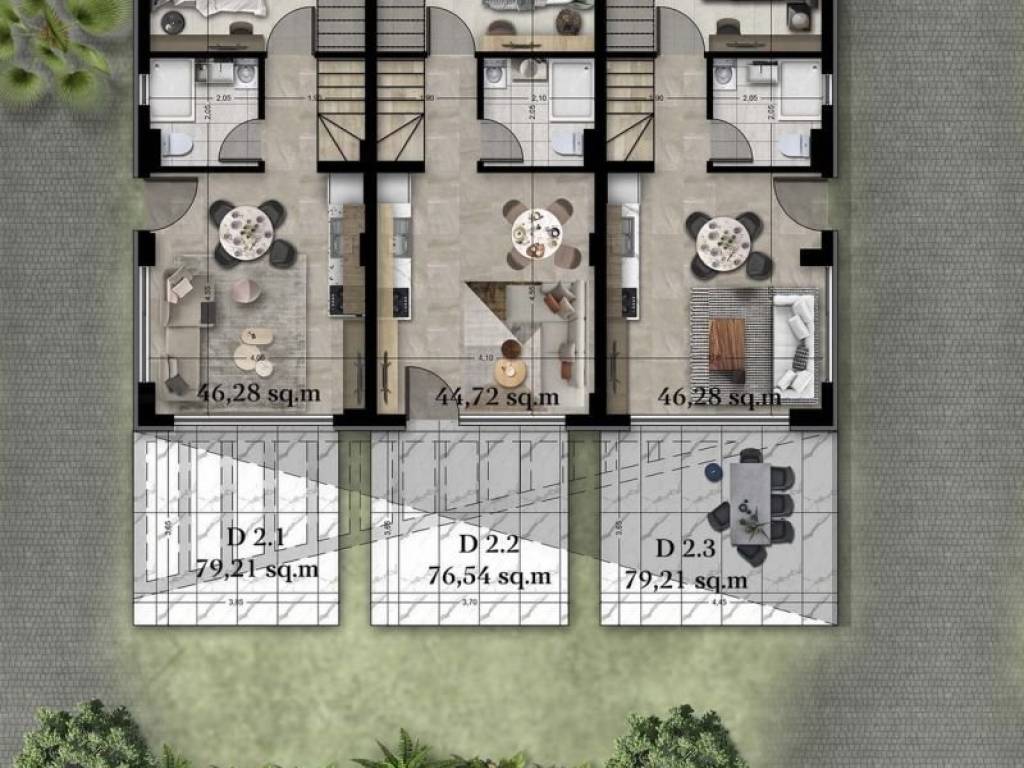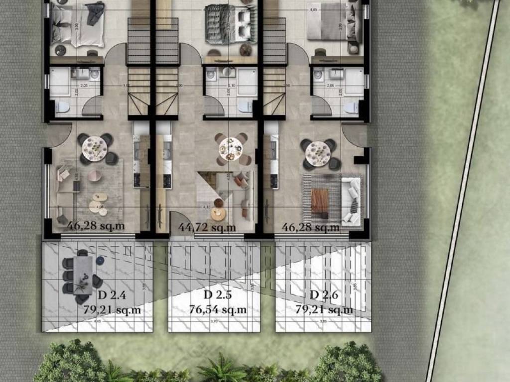 • 12 Two-story Residences ranging from 76.54 sq.m. to 79.21 sq.m., consisting of a living room with kitchen, 2 bedrooms, and 2 bathrooms.