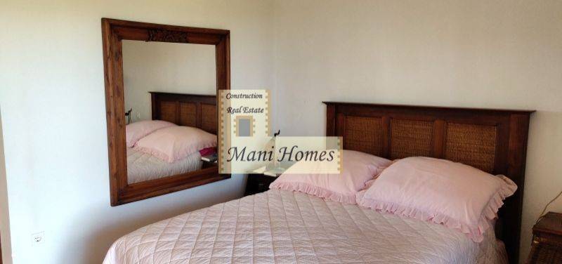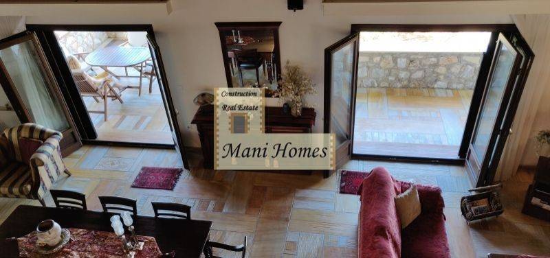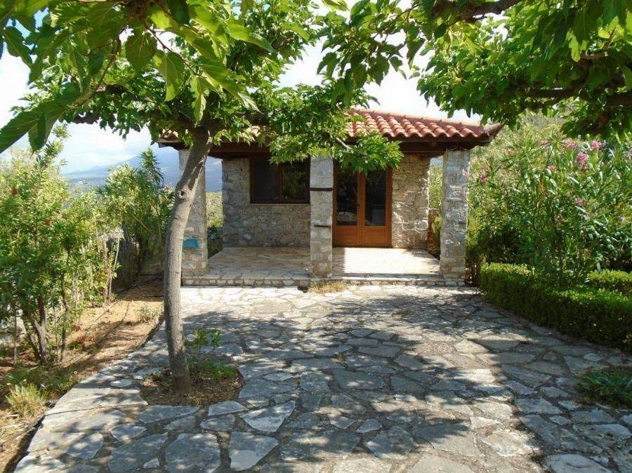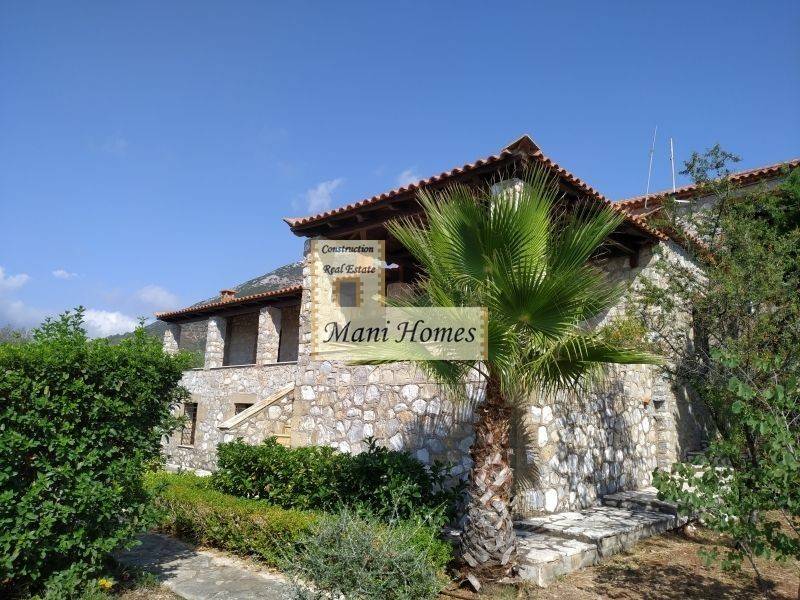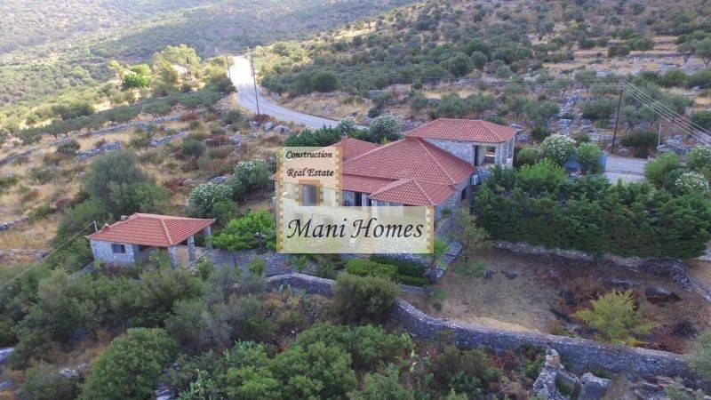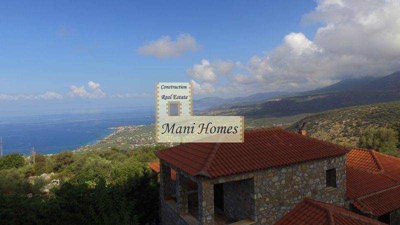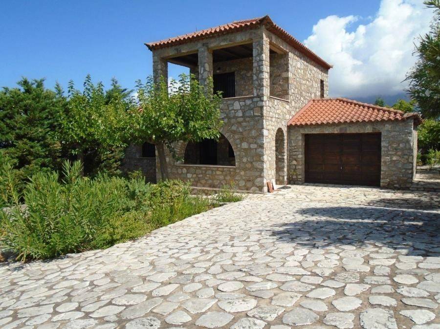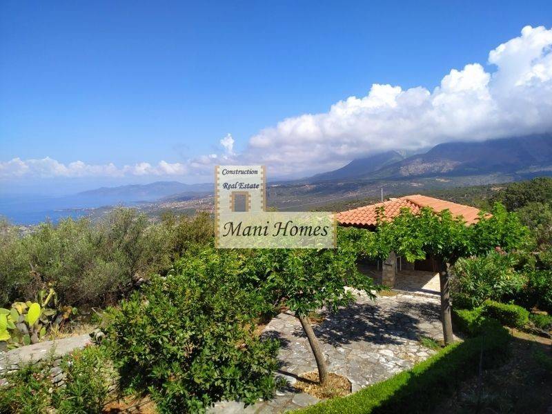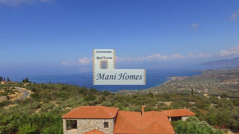 This beautiful vila is set within 4000 sq m of olive groves which are being sold with the house to ensure that the magnificent view is not compromised. Situated in the hills just outside Platsa, yet just 10 minutes by car from the beach and 15 minutes from Stoupa. It boasts beautiful views of the Messinian bay, the Mani coastline and the Taygetos mountains. The first thing you notice about this premium house is the quality of the build. Completed in 2000 to the maximum buildable area of 200sq m, the second thing to notice is that it has an integral garage with automatic door, very rare for houses in this region. There is a main entrance to the front which leads into the kitchen-dining area, and a second main entrance on the side of the house, which leads to an impressive open plan living room with vaulted ceiling. The quality fitted kitchen with its open side into the lounge, has integrated appliances including microwave oven, washing machine and dryer, an American fridge freezer and double sink. The master bedroom with bathroom is located upstairs in the space above the kitchen. The rest of the layout of the house is on the ground floor. There are two further bedrooms which share a bathroom adjacent to the living room. One bedroom has double doors to the long terrace which runs the length of the house There are three sets of french windows leading to the terrace with its commanding views of the coastline and mountains. The covered terrance then extends out from the living room to double the size to allow al fresco dining. Steps lead down to a barbecue area where the grill and kitchen are inside a cottage building with an outside dining space under a pergola. Under the house is a reserve water tank of 4000 litres and a vacuum system linked to suction points on the floor above which avoids the need to drag a vacuum cleaner around when cleaning.