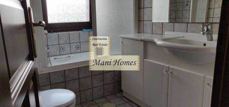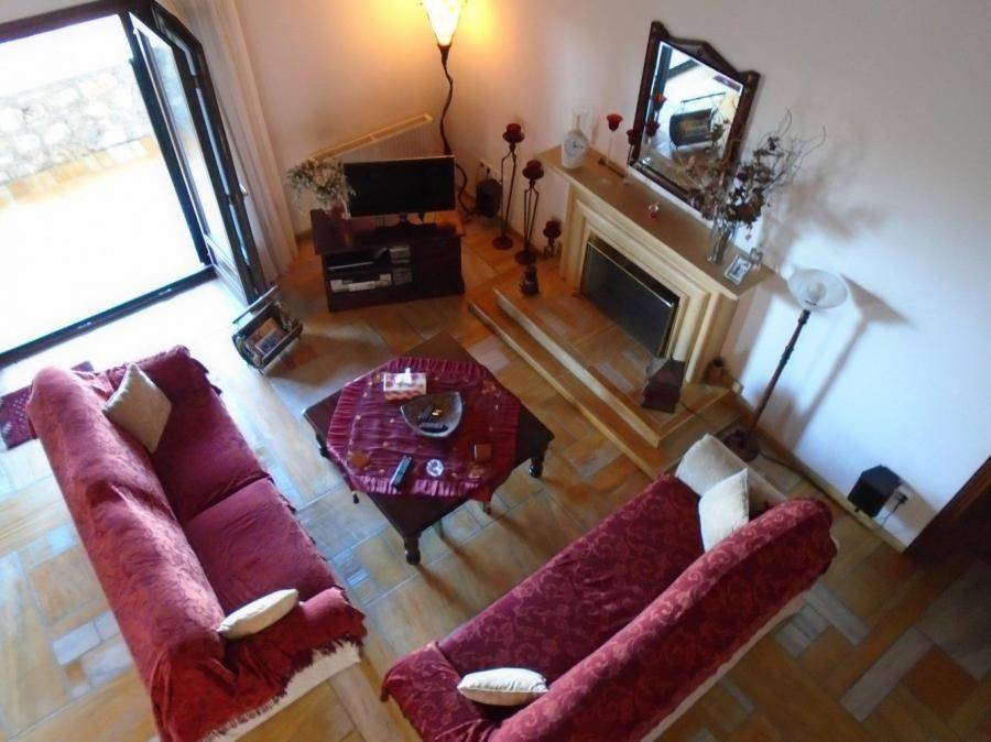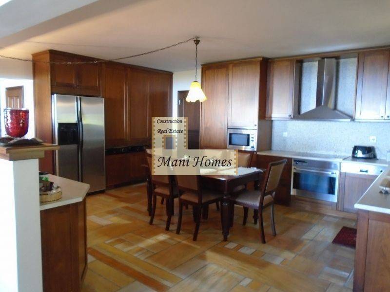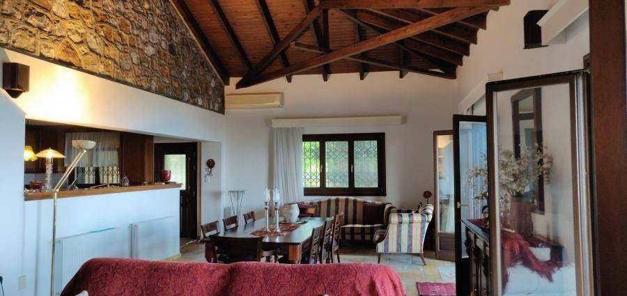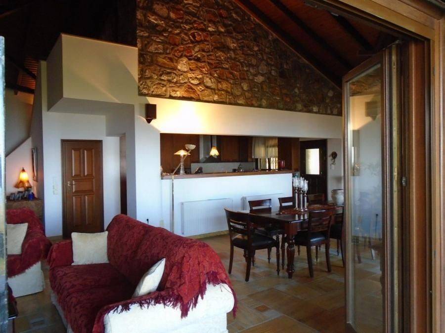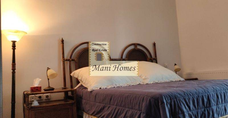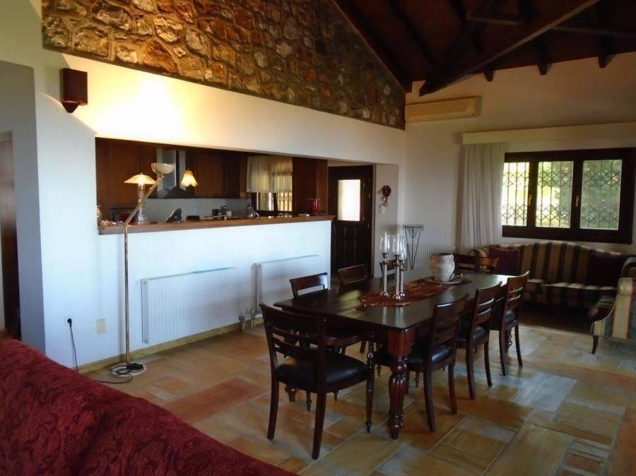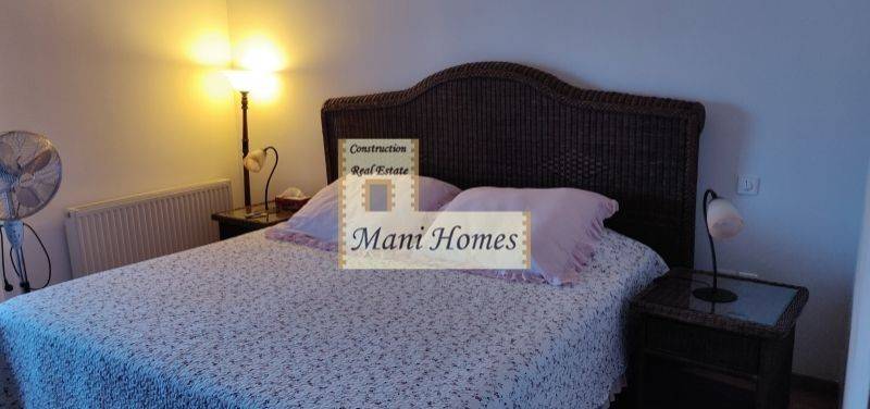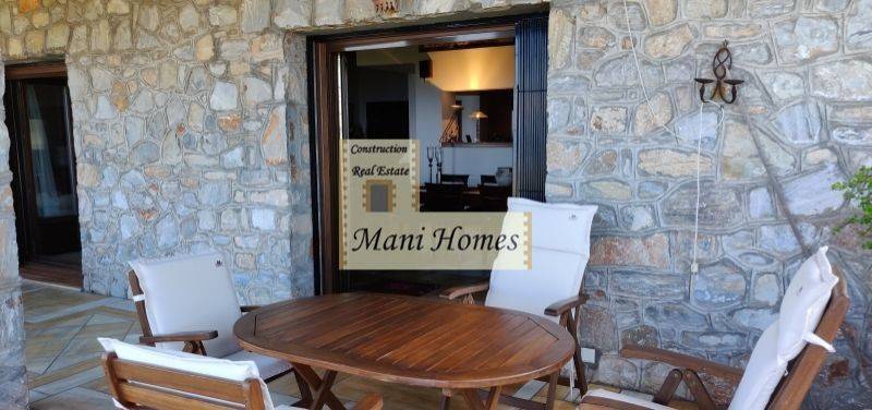 This beautiful vila is set within 4000 sq m of olive groves which are being sold with the house to ensure that the magnificent view is not compromised. Situated in the hills just outside Platsa, yet just 10 minutes by car from the beach and 15 minutes from Stoupa. It boasts beautiful views of the Messinian bay, the Mani coastline and the Taygetos mountains. The first thing you notice about this premium house is the quality of the build. Completed in 2000 to the maximum buildable area of 200sq m, the second thing to notice is that it has an integral garage with automatic door, very rare for houses in this region. There is a main entrance to the front which leads into the kitchen-dining area, and a second main entrance on the side of the house, which leads to an impressive open plan living room with vaulted ceiling. The quality fitted kitchen with its open side into the lounge, has integrated appliances including microwave oven, washing machine and dryer, an American fridge freezer and double sink. The master bedroom with bathroom is located upstairs in the space above the kitchen. The rest of the layout of the house is on the ground floor. There are two further bedrooms which share a bathroom adjacent to the living room. One bedroom has double doors to the long terrace which runs the length of the house There are three sets of french windows leading to the terrace with its commanding views of the coastline and mountains. The covered terrance then extends out from the living room to double the size to allow al fresco dining. Steps lead down to a barbecue area where the grill and kitchen are inside a cottage building with an outside dining space under a pergola. Under the house is a reserve water tank of 4000 litres and a vacuum system linked to suction points on the floor above which avoids the need to drag a vacuum cleaner around when cleaning.