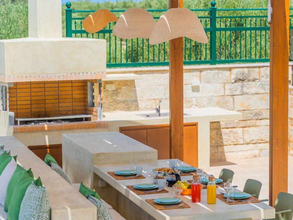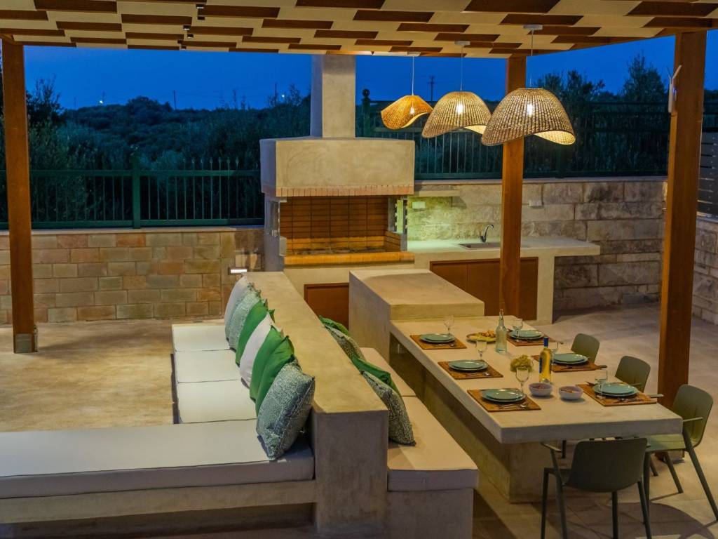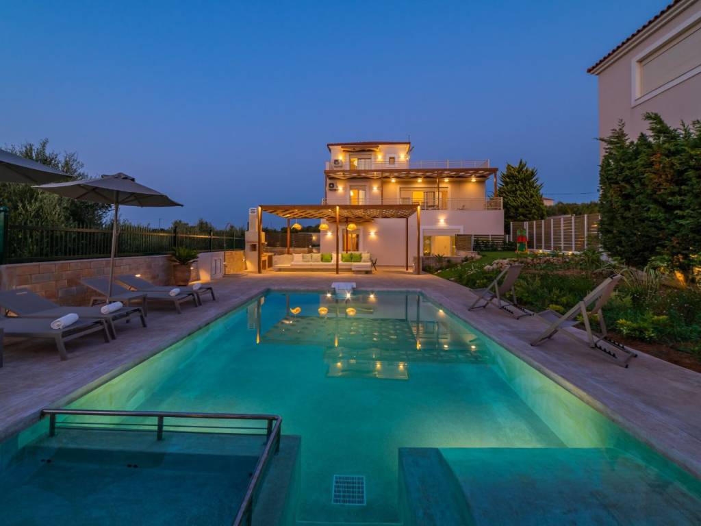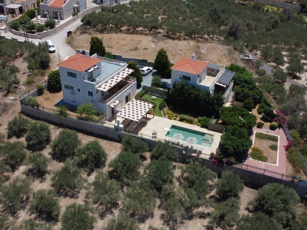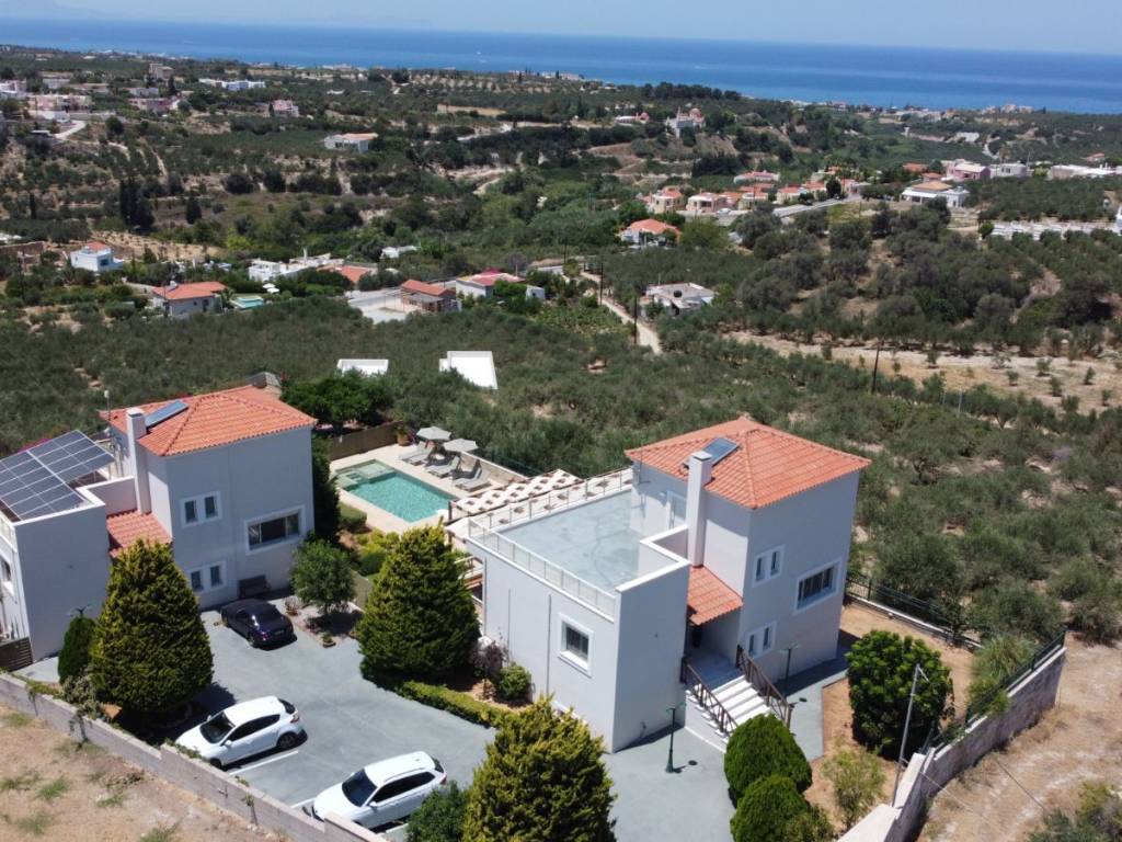 Two stunning villas in Asteri, on a plot of 1650sqm. Each villa is 262,6sqm (525sqm total). They offer unique panoramic views to the sea and the mountains. Each of the villas extends over 3 levels and are beautifully designed, combining luxury with comfort and practicality. With carefully designed spaces and high quality materials, they are the ideal choice for either owner-occupation or tourist use. Their location, in one of the most sought after areas of Crete, combined with the modern amenities they offer, make these villas truly unique. 1st Floor: The main entrance, leads to the first floor, which consists of an open plan kitchen (with a window overlooking Psiloritis), dining and living area, with access to a large veranda with unlimited views of the sea, the White Mountains and the town of Rethymnon. This terrace has a pergola that ensures shading throughout the day. On this floor there are also two bedrooms and a bathroom with bathtub. 2nd Floor: The second floor includes a very spacious bedroom, with large fitted wardrobes and a large veranda offering views of the sea, the White Mountains, Psiloritis and with windows overlooking the sea. On this floor there is also a bathroom with shower. Ground floor: The ground floor consists of a large open plan area that can be configured according to the owner's wishes (gym, work area, living room, kitchen, extra bedroom, etc.) and with direct access to the pool area and barbecue. There is also a bedroom with direct access to the pool and barbecue area, as well as a large bathroom with hydro-massage bath. There is another room that can be converted into a bedroom or used as a storage room. Exterior spaces: There is a modern 40sqm swimming pool, with a separate children's section as well as a built-in sunbed in the water. In addition to the sunbeds with umbrellas, there is also a built-in seating area under a pergola. The barbecue area is comfortable and covered with a large pergola. It has a built-in dining table for 10 people, a bench, enclosed cupboards and a sink, all ideal for entertaining in the garden. The materials used are curtain type on the built-ins and micro pebbled flooring, which extends into the pool. The external lighting is complete and flexible to make the evening environment both safe and atmospheric. The garden has been landscaped with various types of plants and trees and automatic watering. There is also a separate section of artificial lawn so that children can play safely. Other information: The villas are located on a plot of 1650sqm, fenced and with an electric garage door for maximum privacy and security. Also for the outside area industrial flooring has been used and there are 6 spaces for private parking. The villas are equipped with a new photovoltaic system (net metering) that produces ~13,000 kilowatt hours per year offering zero electricity charge. The electrics are modern as they have structured wiring, security lights etc. In one villa, a ground floor room is configured as a home cinema. All rooms and spaces have new inverter type air conditioners, and central autonomous heating. There is a central water filtration & water softening system, and each villa has its own water tank with pump and 3-function boiler (solar, electric). The garden has irrigation water. Sold with Miele appliances (cooker, extractor hood, dishwasher), and furniture is available on request/negotiation. Information about the village of Asteri: Asteri is a picturesque and beautiful village in the municipality of Arkadi in Rethymno. It is strategically located, just 15 minutes drive from the town of Rethymno, and 4 minutes from the sea, in the centre of the northern side of Crete. Asteri has experienced significant residential development in recent years, with many newly built and renovated properties. The residents of Asteri are known for their hospitality and friendliness, adding to the charm of this beautiful village. The village offers a calm and welcoming atmosphere, ideal for those seeking the tranquility of life in the countryside, while having easy access to the amenities of the city.