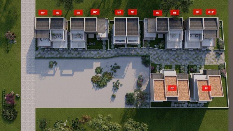 • 8 two-storey residences of 70,97 sq.m, consisting of a living room with a kitchen, 2 bedrooms and 2 bathrooms.