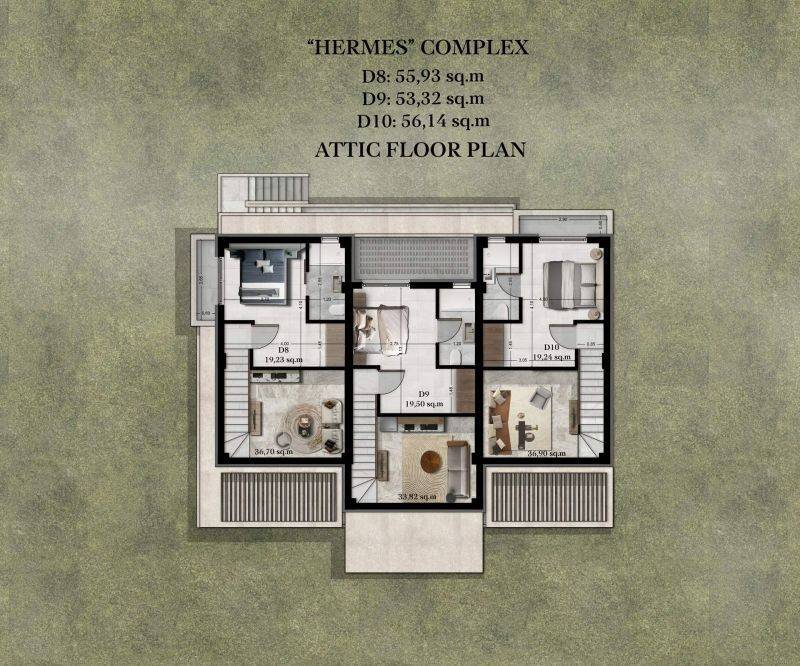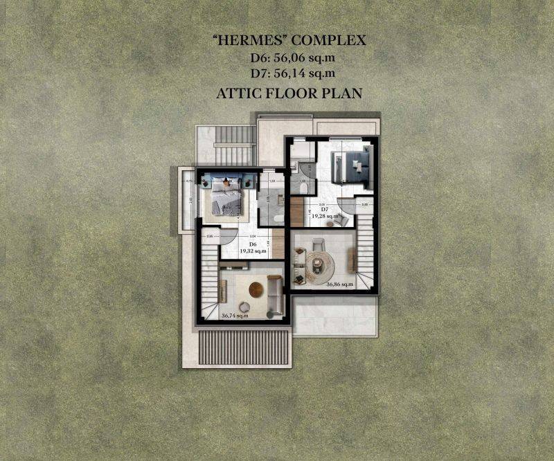 • 5 first floor apartments with attic from 53,32 sq.m to 56,22 sq.m, consisting of living room with a kitchen, 2 bedrooms and 2 bathrooms.
