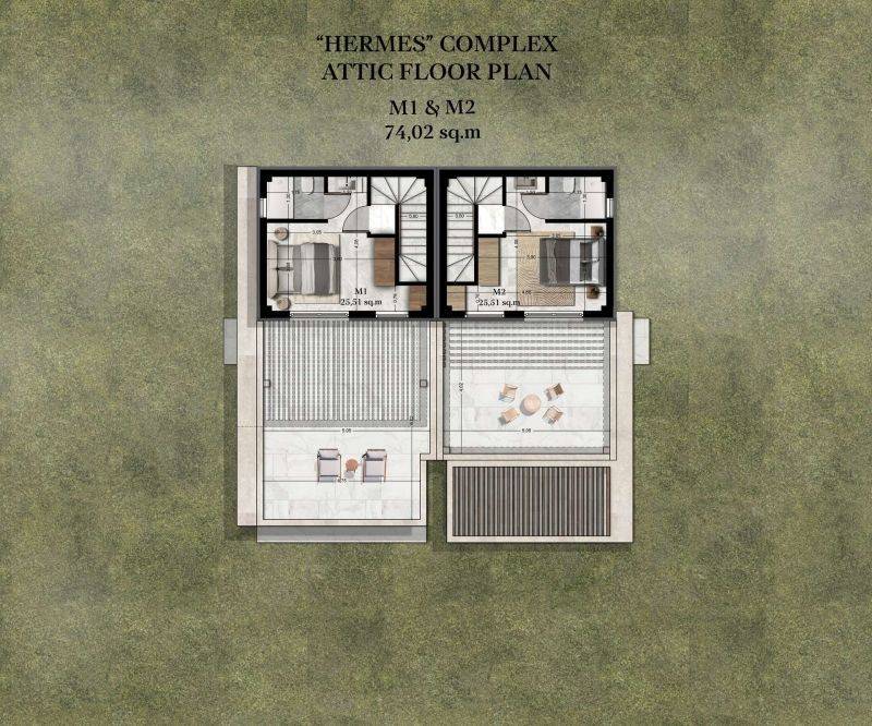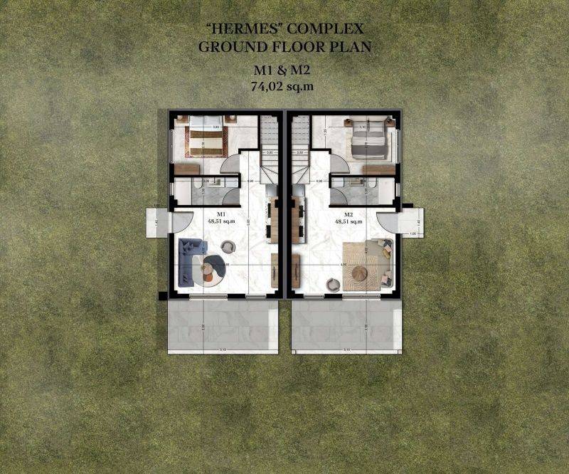 • 2 two-storey residences of 59,75 sq.m, consisting of a living room with a kitchen, 1 bedroom and 2 bathrooms.