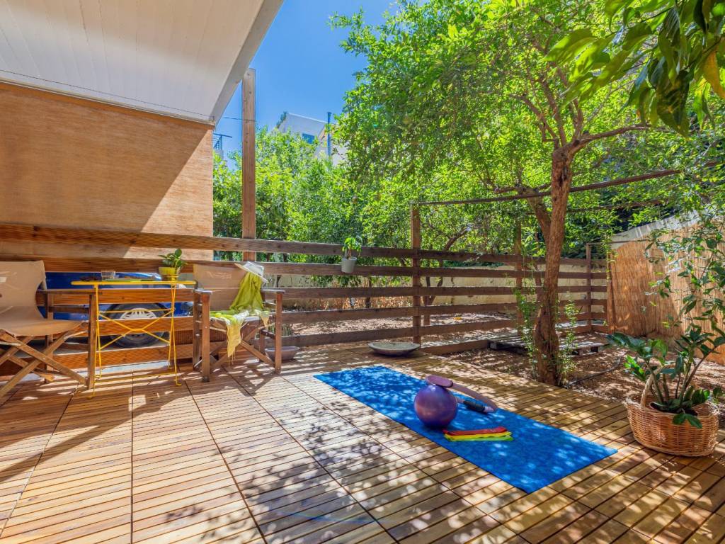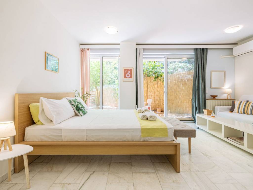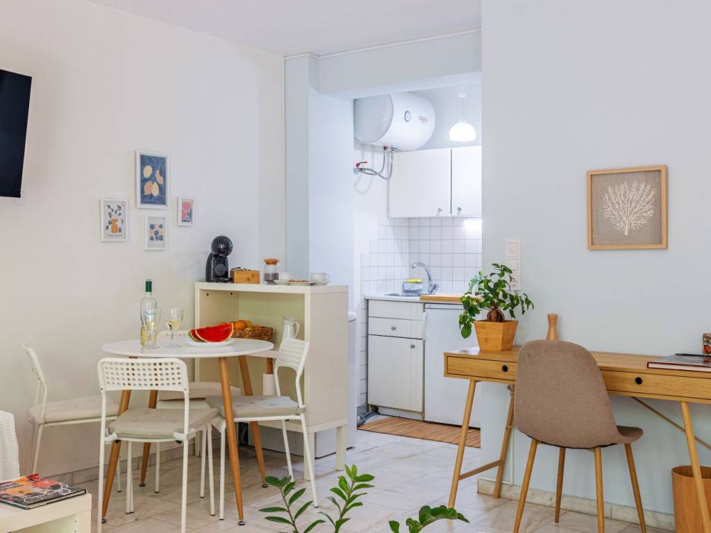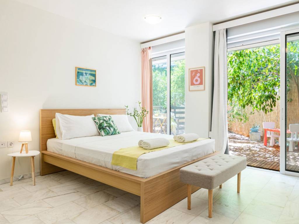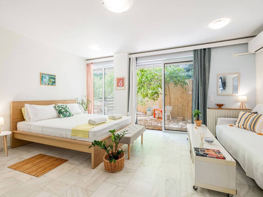 A lovely, spacious, self contained,renovated, garden studio 35 s.m with an awsome, full private, spacious, sunny deck veranda 25 s.m. with relaxing mediterannean garden views of lemon /pomegranate trees and cretan herbs. It is ideal for one person for a mid term stay until end of June 2026 max. for remote work, studying, travelling or working in the capital of Crete, Heraklion city, just 10-15 min. walk far from the city center or 10 min drive far from sunny, sand beaches. Long term stay is negotiable. In this retreat style apartment, located in Mastambas, in Stergiogianni street, in one of the most privileged, safe residential areas of Heraklion, you will have the oppurtunity to live like a middle -up local, in a thoughtfully designed, well accomodated, with all comforts accomodation. . Amenities: A.C, 12.000 btu / 43 smart TV/ high speed Wi- Fi /desktop/ bookcase/ queen bed/ sofa bed/ dining table/ chairs/ outdoor furniture/ washing machine in house/ induction stove/ oven /fridge / toaster /espresso machine /Kettle/ hot water supply/ Kitchenware/ linen /hair dryer/ iron /drying rank /electric vacuum/ cleaning equipment, built in wardrobe/mosquito net. The neighborhood has everything nearby: In the area there are 2 large supermarkets, gym, bakery, grocery, meat/fish market, cafes, restaurants, pizzeria, souvlaki restaurant, bus/ taxi stations, pharmacies, bookstores, wellness services.. You will need only 5 min walk to reach Eukalyptus, the largest green park area of the city, the famous Venetian walls for long walks above the city with marvellous sea views and the Cultural Conference Centre of Heraklion too. All you need to bring is your personnal belongings.. The apartment is allready available. The rent is 550 euros /month for a mid term stay until end of June. The price for electricity, hot water supply by electric heater, water supply, common expenses and high speed wifi will be plus +190 euros/ month. There is also the availability to rent a private parking place in the building for 4 euros/day. Please contact via +30 6944950683 for availability or any further information.