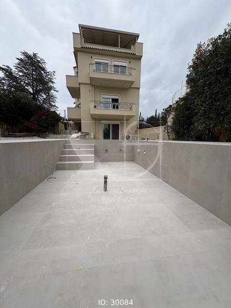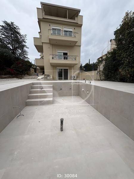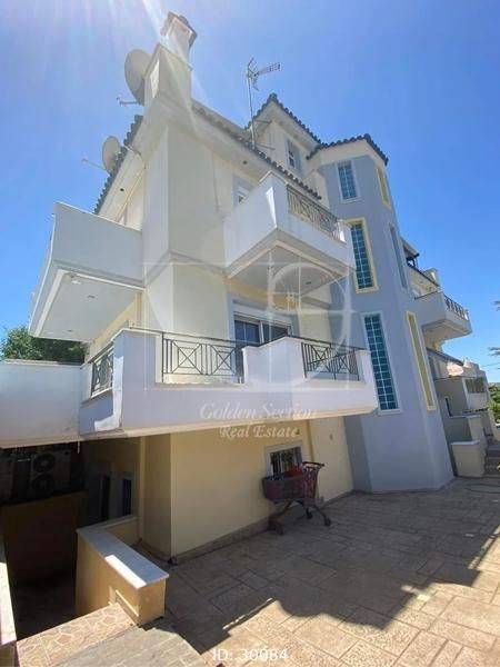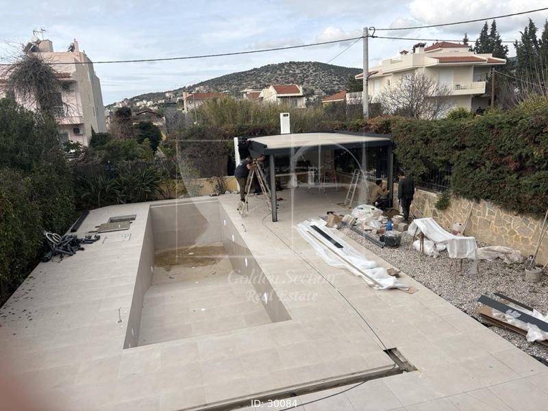 Kalyvia Thorikou, Lagonisi - Detached House 340sqm plot 560sqm, electrical appliances furnished, bedrooms 4, master bedroom, levels 3, renovated, year built 2003, renovation year 2025, energy class C, 2 living rooms, hall, 2 kitchens, 4 bathrooms, 2 wc, heating type: autonomous (oil), air condition, parking covered, quiet, dual aspect apartment, luminous, corner, sea view, frontage, painted, drop ceiling, electric roller shutters, storage space, boiler, fireplace, balconies, tents, garden, garden 450sqm, aluminum frames, double glazed windows, door screen, ceramic tiles floors, separate kitchen, without common charges, three phase electricity, secure door, surveillance cameras, swimming pool, private pool, internal staircase, barbeque, playroom, guest house, ev charger, satellite, residential zone, south-western orientation, access from asphalt.