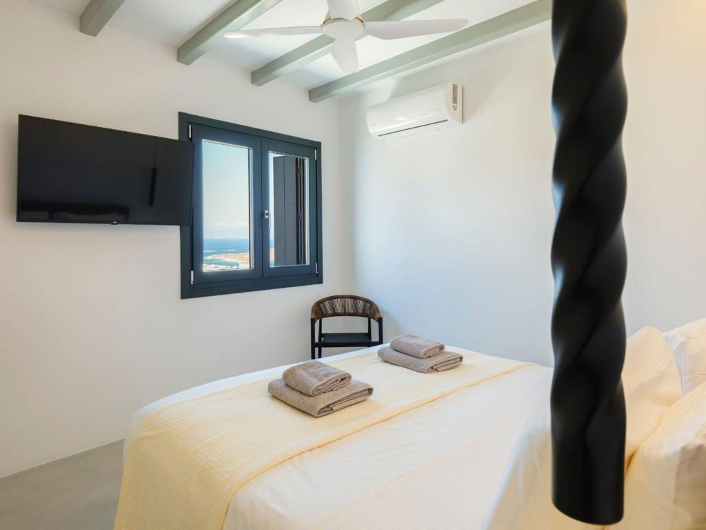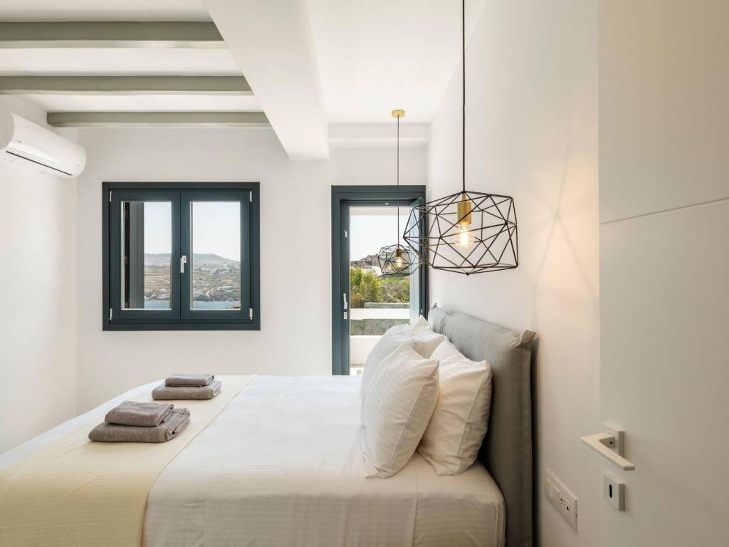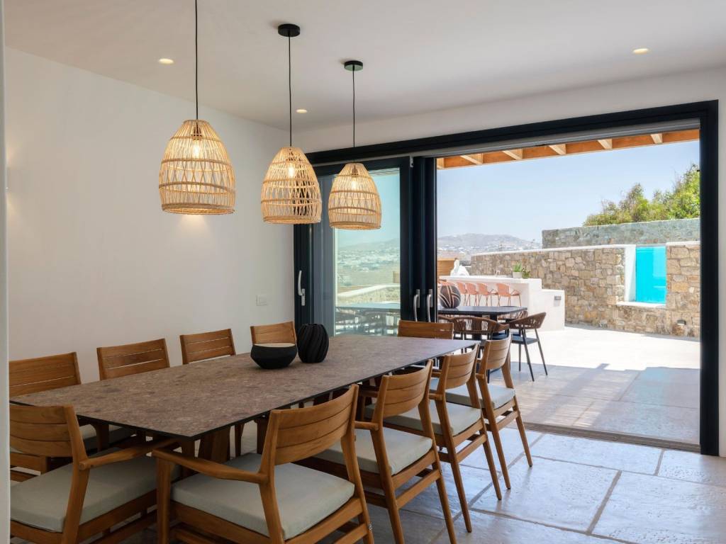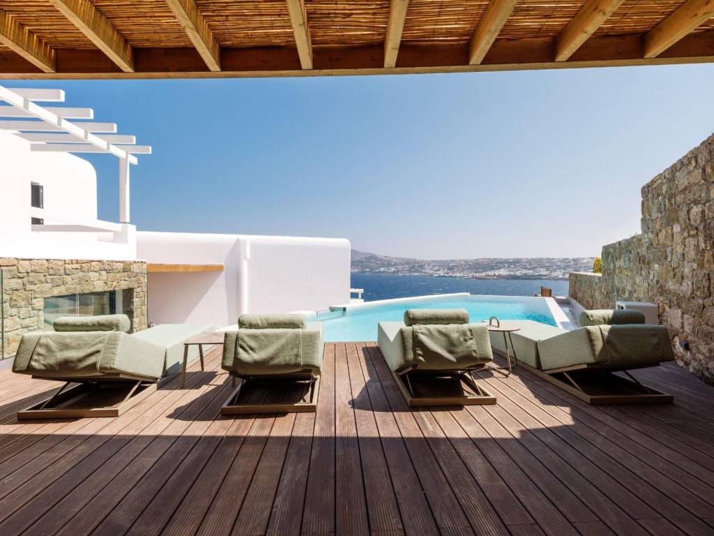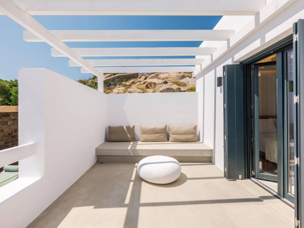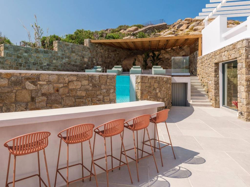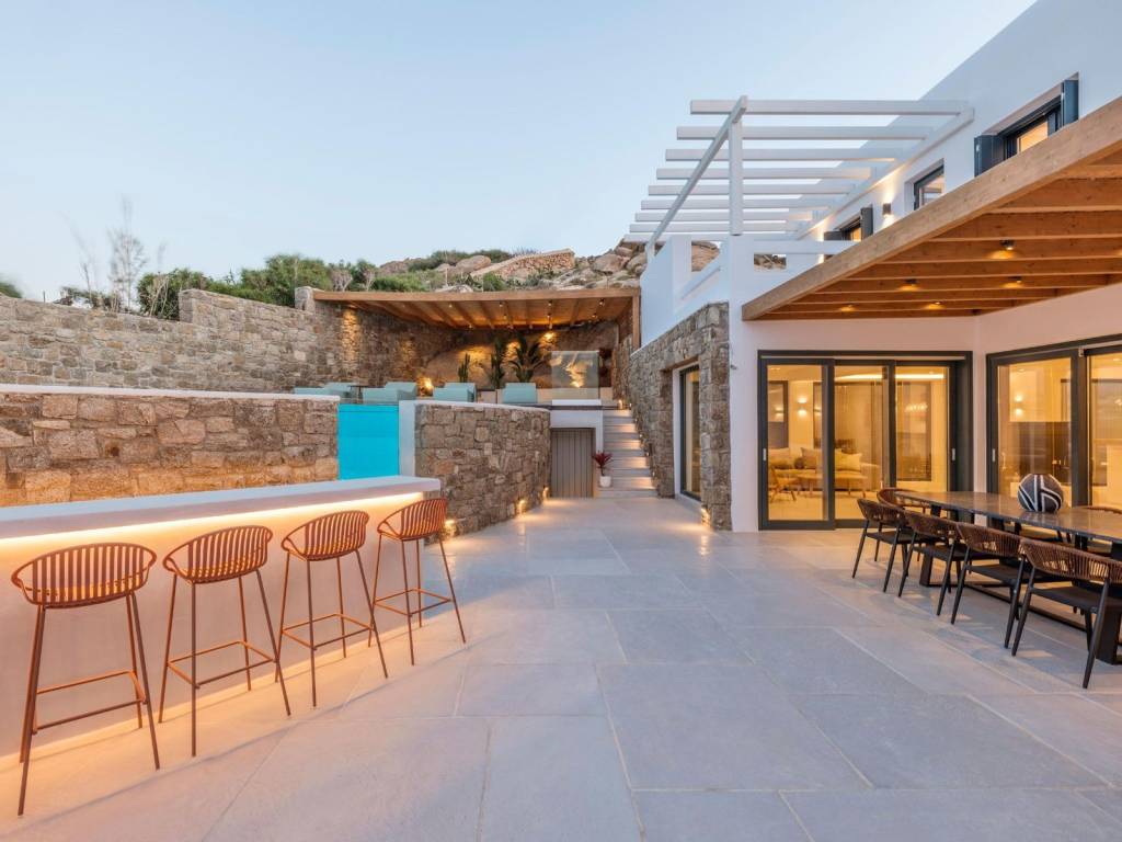 The villa extends over two levels of 215sq.m in total. The ground floor comprises an open concept kitchen leading to comfortable dining and living/sitting areas, two double bed master bedrooms with en-suite facilities, a storage and a guests’ bathroom. A flight of stairs up the upper level stretches featuring four double bed master bedrooms with en-suite amenities and a cozy corridor leading to balconies with panoramic views overlooking both the crystal-clear Aegean Sea waters and the Myconian backdrop. The plot of the Villa Aquamarine is 900 sq.m. and it has been professionally landscaped with terraced gardens. A garden pavilion has been placed near the swimming pool deck to take advantage of the unobstructed vistas of the Cycladic enchanting setting. The outdoor premises are mainly flanked by broad terraces, which afford a pool bar, pergola-covered seating areas and a barbeque spot. What is more, the stunning horizon-edge swimming pool develops the impression to the swimmers of floating in the emerald-blue Aegean Sea. The villa is almost adjacent to the sea front, located some 100 meters away from the shore and boasts the utmost privacy bestowed by a natural inlet bay. A bit further one can enjoy the benefits of the famous Ornos beach while only two kilometers away Mykonos downtown offers both cosmopolitan day experiences and bustling nightlife. This luxury newly-built Villa is a harmonious blend of spaces for accepting visitors and guests, or for casual family gatherings equally pervading. *Τhe Energy Certificate is under issue process. The word «Ornos» means «out of the wind (windless)» according to the local dialect. The name of the district emanates from the «opposite» region which is called «Korfos» that means «blustery when the northern wind is blowing». Both the bay of Ornos and the beach are two of the most popular areas in Mykonos. The neighbourhood affords a wide range of amenities and it is a frequent anchorage of a lot of boats and yachts. The region of Ornos extends in the south side of Mykonos island and it boasts both developed and resort environs. Last but not least Ornos is just three kilometres away from Mykonos «chora» (the capital town of Mykonos) and is accessible by car in just a few minutes.