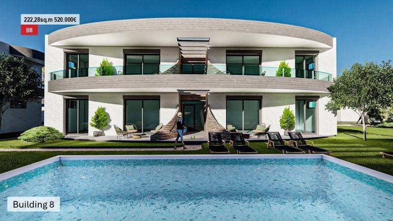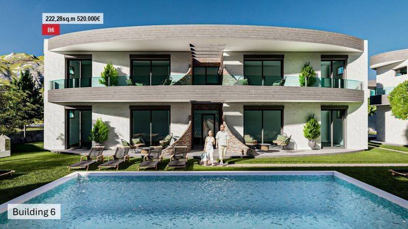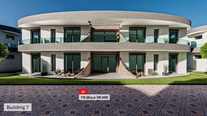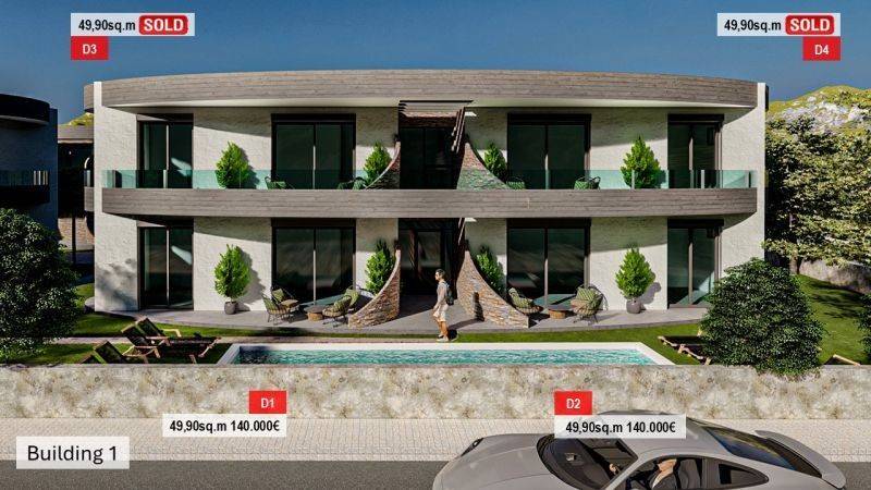 • 14 Ground floor apartments from 49.90 sq.m to 57.94 sq.m , consisting of a living room with kitchen, 2 bedrooms, and 1 bathroom.