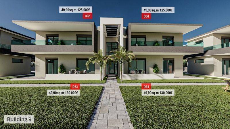 • 14 Ground floor apartments of 49.9sqm, consisting of a living room with kitchen, 2 bedrooms, and 1 bathroom.