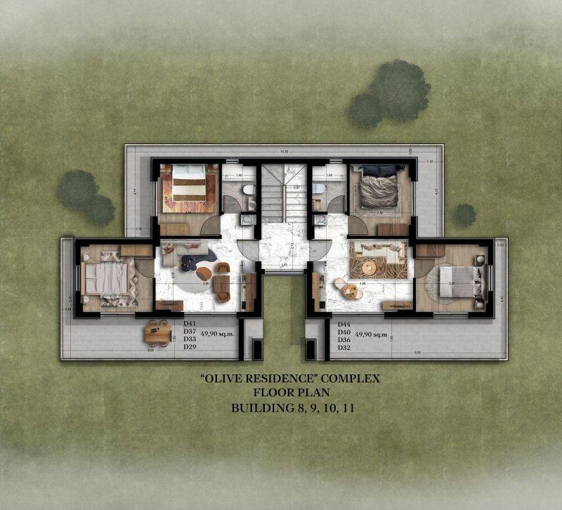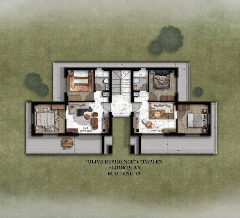 • 14 Apartments of 49.9sqm, consisting of a living room with kitchen, 2 bedrooms, and 1 bathroom.