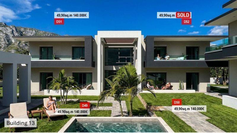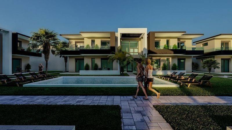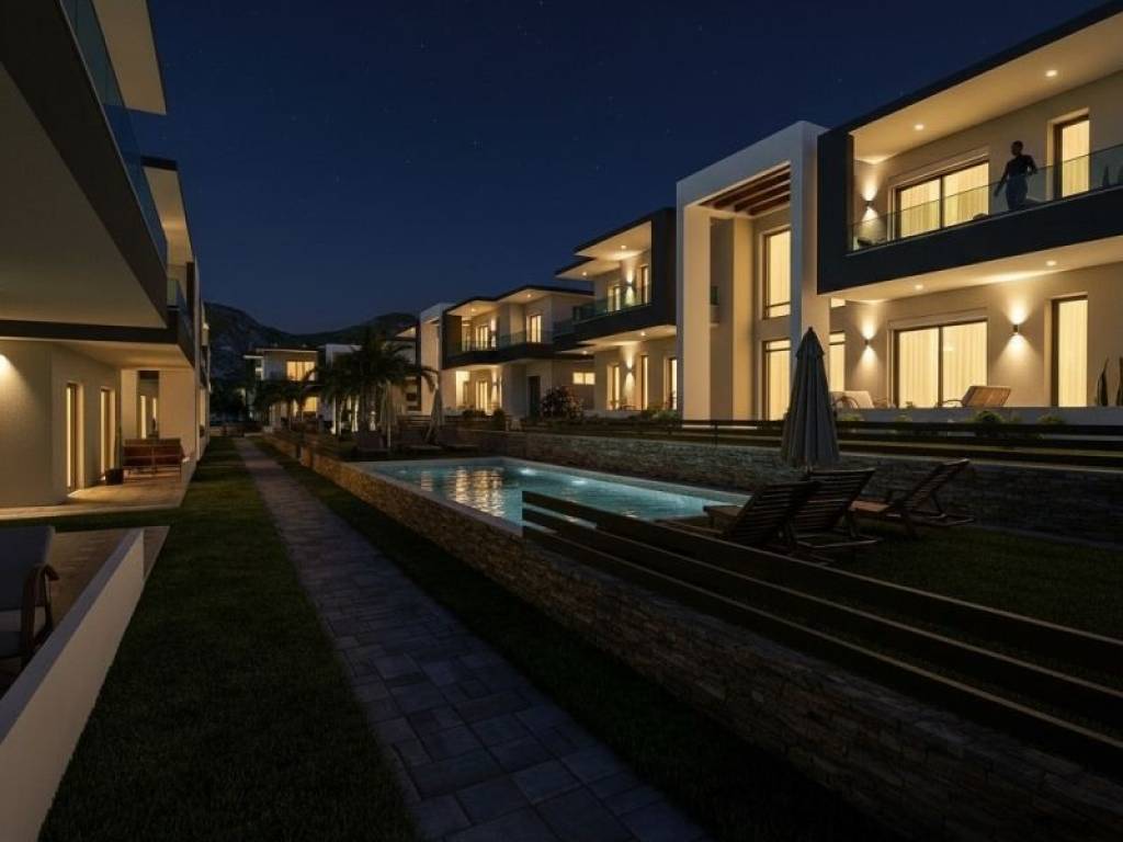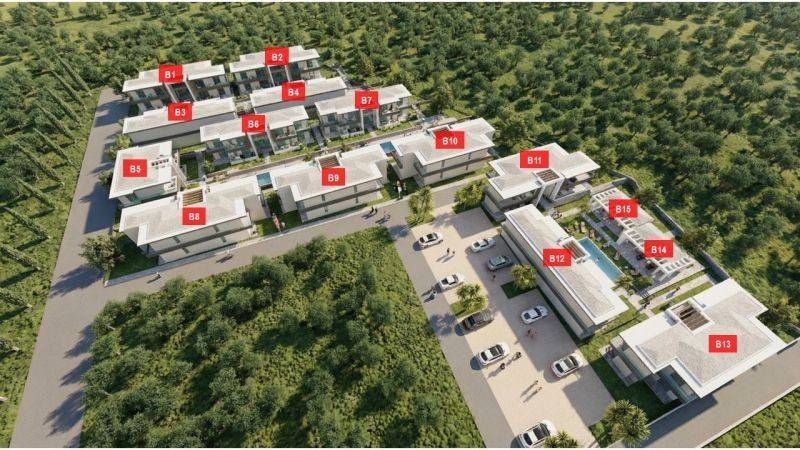 It consists of 54 residences, emphasizing modern design, within a closed fenced area providing security and tranquility. The materials and design are harmonized with the natural landscape, creating a harmonious blend between contemporary aesthetics and the traditional value of the area. Additionally, the complex has communal swimming pools, tastefully landscaped green spaces with trees and parking spaces.