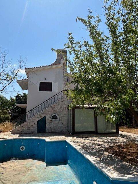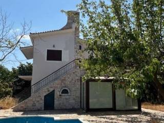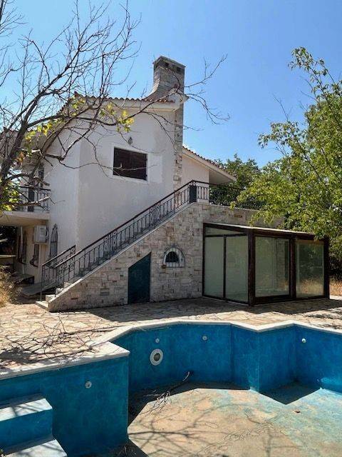 rustic aesthetics, with wooden frames and a staircase, consists of a basement 103 sq.m. (auxiliary spaces, storage room, boiler and space converted into an apartment), ground floor 93 sq.m. with reception area, kitchen, WC, living room with patio and 1st floor bedrooms with bathroom, balconies. Garden with swimming pool 21.60 m2, small church within the plot, parking space fitting 2 cars or a large one, located in a neighborhood with permanent residences