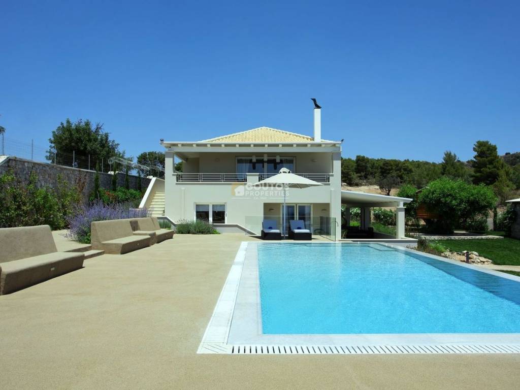 On the eastern side of the Peloponnese, in the beautiful area of Petrothalassa, a luxurious independent house of 250 sq.m. is available for sale, within a fenced plot of 2,014.28 sq.m. Its location is ideal for those seeking tranquility, natural beauty, and unobstructed sea views, while at the same time being in close proximity, less than 1,500 meters, from a magnificent sandy beach. The residence was built in 2023 with luxury, simplicity, and high quality in mind, making it suitable for both permanent and vacation living. Its architecture combines modern elements with the natural aesthetics of the landscape, creating a space of harmony and comfort. This luxurious villa includes a total of 3 living rooms, dining areas, 3 kitchens, 6 bedrooms, and 3 bathrooms. Designed with a minimal aesthetic and furnished with high-quality furniture and appliances, it can accommodate 10-12 people. The main volume of the residence is developed on two levels. On the ground floor, there is a 99.19 sq.m. apartment that includes a spacious open-plan living room, dining area, kitchen, 2 bedrooms, and 1 bathroom. Externally, in direct contact with the apartment, there is an 18.92 sq.m. storage room for additional storage needs. On the first floor, there is a second apartment of 92.97 sq.m. with a similar layout to the ground floor, offering comfortable living spaces with an open-plan living room, dining area, and kitchen, 2 bedrooms, and 1 bathroom. The large openings and balconies offer a breathtaking view of the sea and the natural landscape. In the pool area, which is designed to offer moments of relaxation and entertainment, there is an infinity pool of 47.85 sq.m. with a surrounding area appropriately arranged with built-in benches, a spacious deck for sun loungers, and a modern pool bar for enjoying refreshing cocktails by the water. In the area next to the pool, in an elegant underground construction, there is a separate building (guest house) with an additional apartment of 65.88 sq.m. featuring an open-plan living room, kitchen, 2 bedrooms, and 1 bathroom. Next to it, there is a 19.15 sq.m. storage space, where the pool’s engine room is also housed. The surrounding area of the residence is one of the most impressive aspects of the property. The well-maintained garden, with lush trees, ornamental plants, and a specially designed artificial stream, creates an idyllic atmosphere of relaxation. The outdoor lighting has been designed to highlight the beauty of the landscape during the evening hours. The BBQ area is fully equipped, covered, and features a bathroom, providing the ideal space for gastronomic delights. Additionally, there is a covered parking space for four cars, ensuring convenience and functionality for the residents. For young visitors, in addition to the pool and contact with nature, a beautiful high-standard wooden playhouse has been created, adding an extra touch of fun and entertainment. Petrothalassa is an area that combines the tranquility of nature with the cosmopolitan atmosphere of nearby destinations. Its proximity to Porto Heli and Ermioni provides easy access to luxurious amenities such as fine dining restaurants, cafes, and boutique shops. At the same time, the nearby islands of Spetses and Hydra offer rich history and cultural events, making them excellent destinations for day trips. Visitors and residents of the area have the opportunity to explore crystal-clear beaches, enjoy hiking in nature trails, and taste local specialties in traditional taverns. Access to Athens and the international airport is easy via the road network or by boats from nearby ports. This unique residence is an exceptional investment opportunity for those seeking a luxurious property in one of the most beautiful areas of Greece, offering privacy, comfort, and the ultimate harmony with nature and the sea. ID 1319958 For more information and appointments: Goutos Properties Phone: 210 971 5711 Email: sales@goutos.gr Website: www.goutos.gr