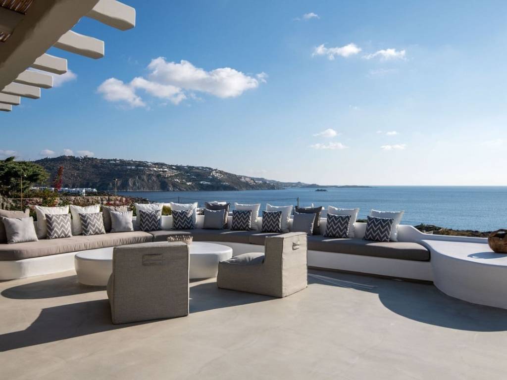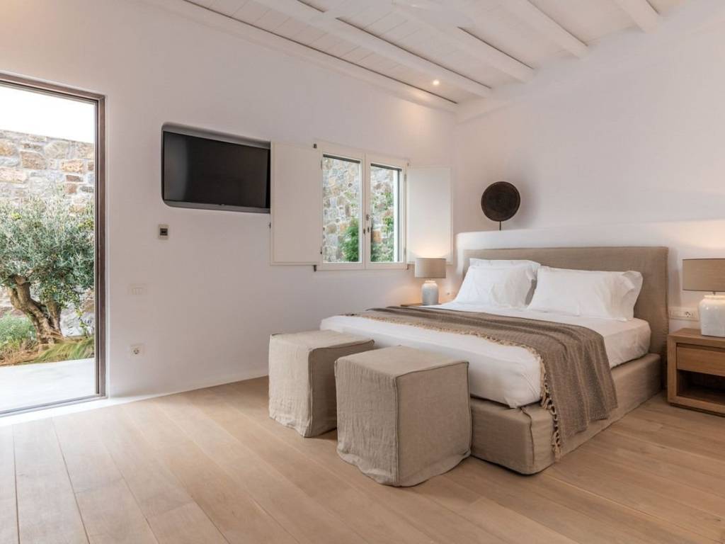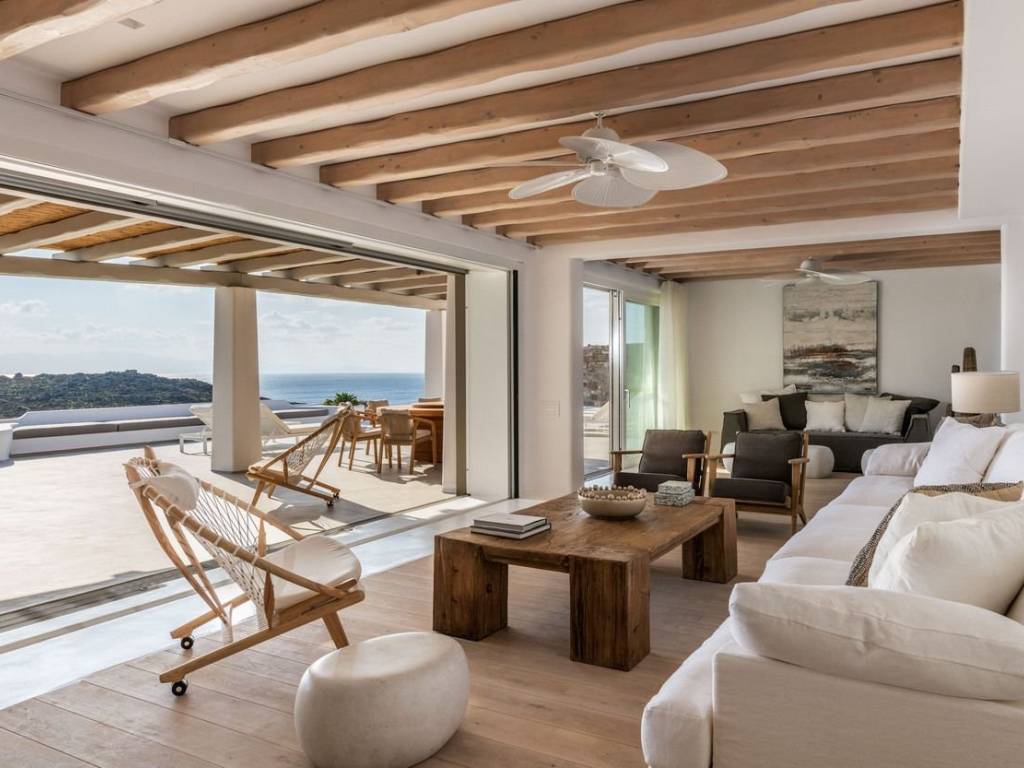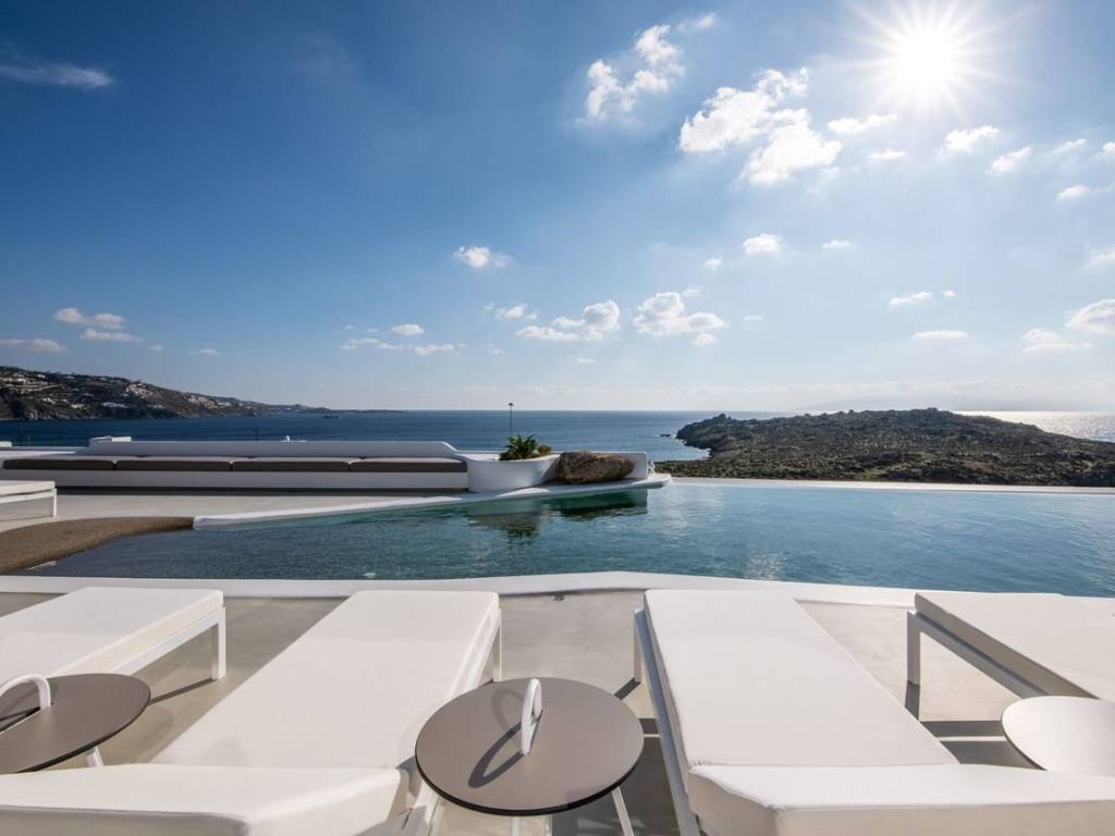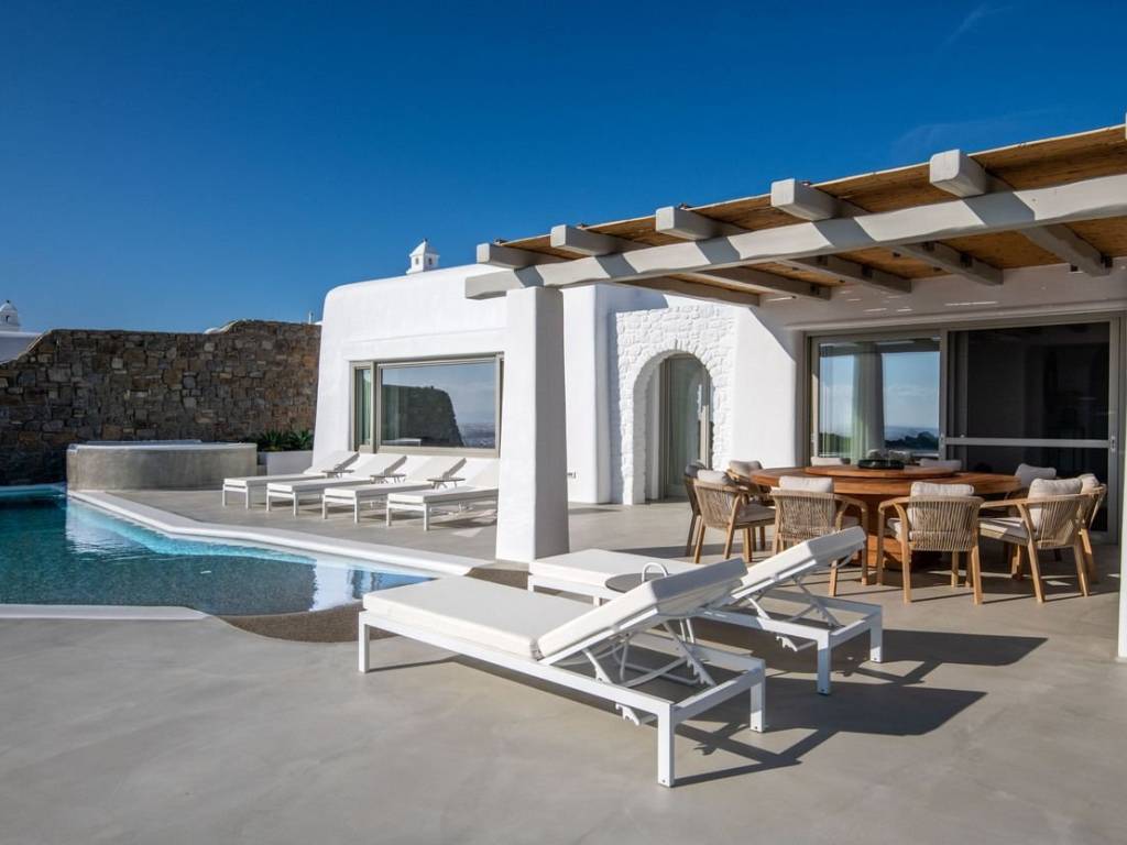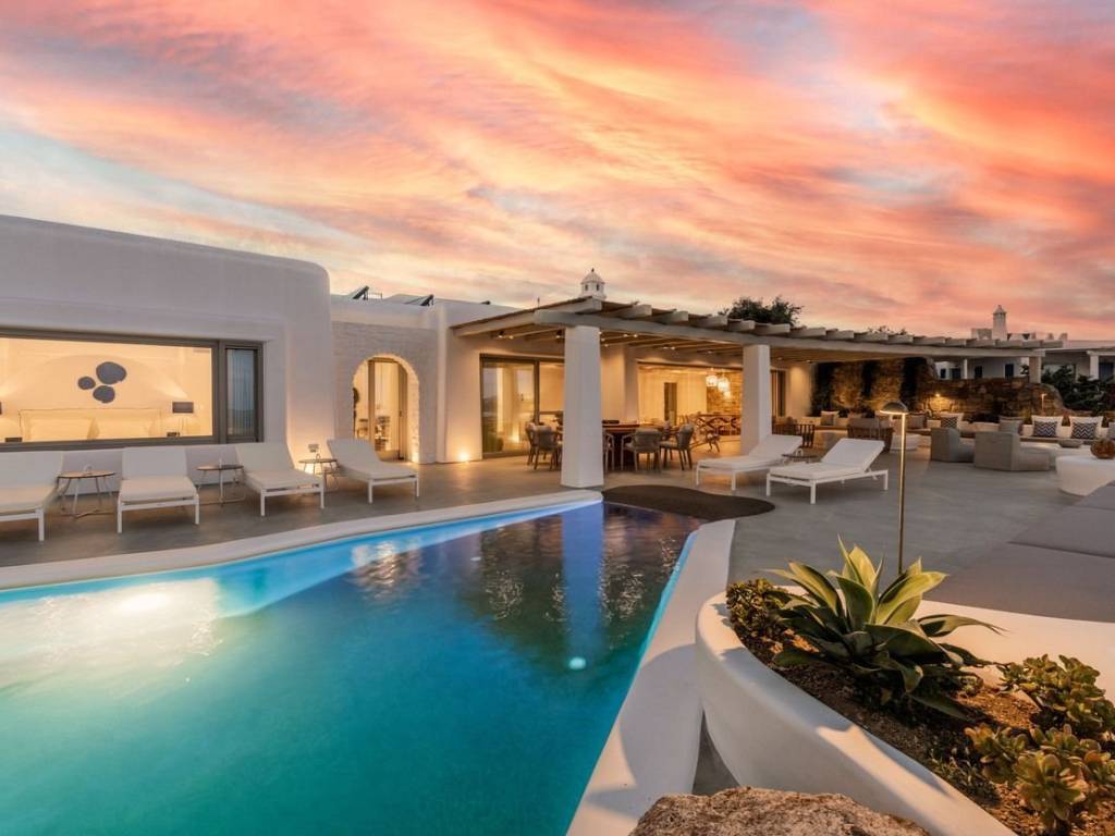 This luxurious villa is located in the Cavo Glyfadi area of Aleomandra, Mykonos. The residence offers stunning sea views and panoramic sunsets, set on a 1,000 sq.m. plot with approximately 710 sq.m. of built space. The property features an expansive swimming pool with jacuzzi, sun-drenched terraces, an open-air bar, shaded seating and dining areas, and a barbecue corner. Due to the hillside location, the villa extends over two levels. The interior combines Mediterranean charm with elegant, contemporary design. The ground floor includes five master bedrooms with direct access to wellness amenities such as a steam room (“hammam”) and a gym. Additional facilities on this level include a laundry room, an en-suite bedroom for service personnel, and independent staff quarters. The first floor houses an open-plan living and dining area, a fully equipped modern kitchen, a master bedroom, and a guest toilet. High-quality finishes and thoughtful details are present throughout, including wooden-plank ceilings, oak flooring, a lift, an alarm system, pre-installation for CCTV, and a solar water heating system. This villa combines refined design, luxury, and functional planning, offering privacy, comfort, and spectacular views while integrating seamlessly with the Aleomandra coastline. The unique beauty and appeal of Mykonos island are palpable from the very first moment onwards. Its majestic rolling topography and its unbeatable Cycladic backdrop set the island among the most sought-after destinations worldwide. Mykonos is one of the trendiest islands globally since it blends superbly bustling and hustling cosmopolitan areas with urban life and vivid nightlife, with romantic and idyllic remote lodges for homelovers. The sunny Cycladic plateau of the island exceeds all year round while the Myconian scenery provokes various leisure challenges. It is composed of picturesque bays, such as Ornos, with glitteringly white beaches and turquoise Aegean Sea waters that boast a panoramic outlook of the islets “Delos” and “Rheneia”. On top of that the majority of the bays of Mykonos constitute a frequent anchorage of many boats and yachts for those who would rather a more developed resort atmosphere. Mykonos is an “international cradle” and “multi-cultural meeting point” for fashion trends, artistic and social movements, and business jet-set. Mykonos is just two and a half hours flight from central Europe and some twenty-five minutes flight from Athens. Last but not least it belongs among the top destinations for return of investment within the Mediterranean region.