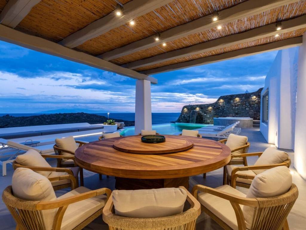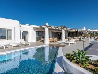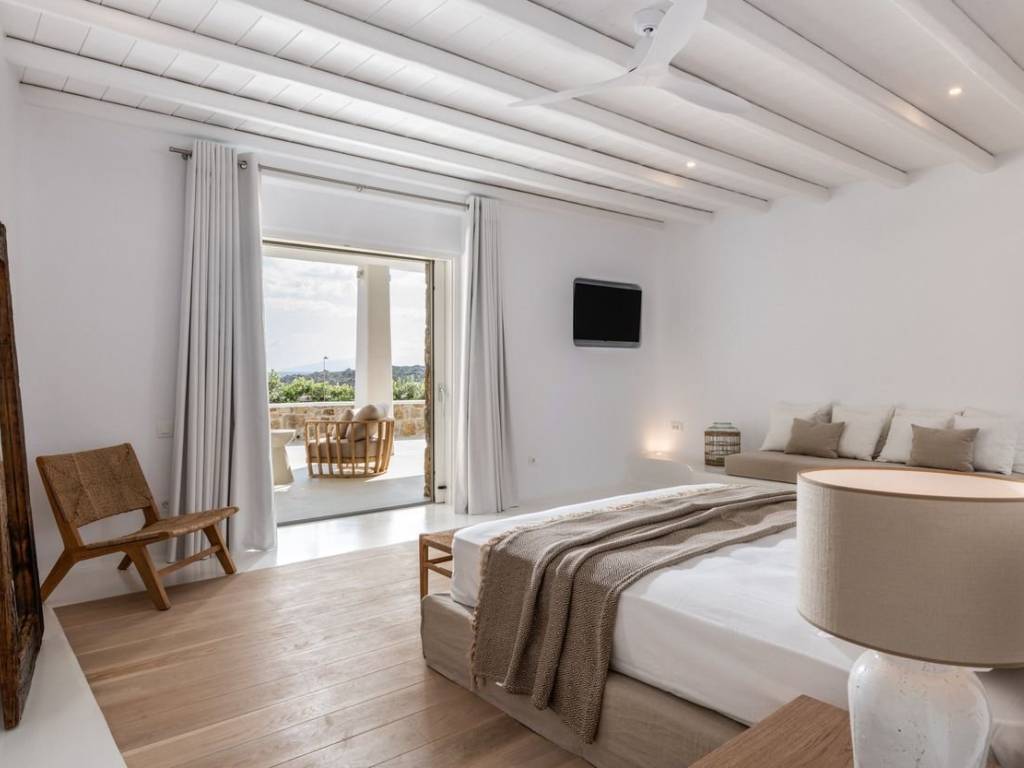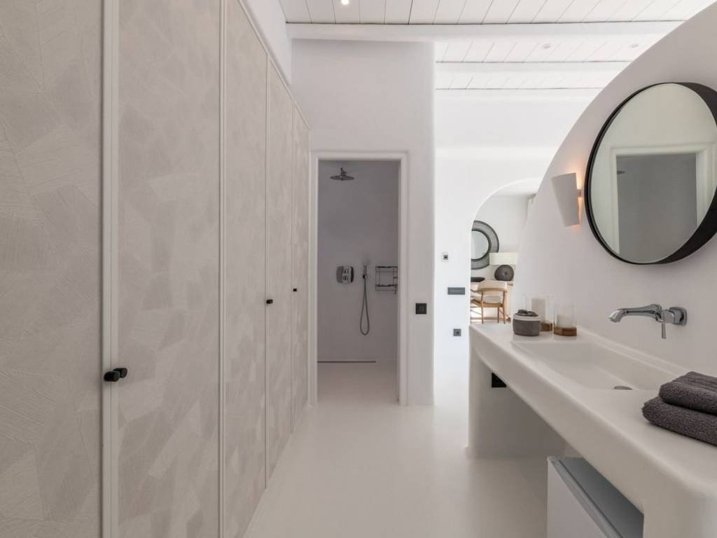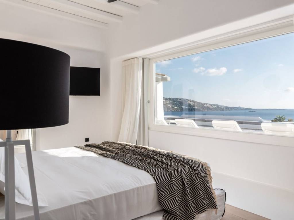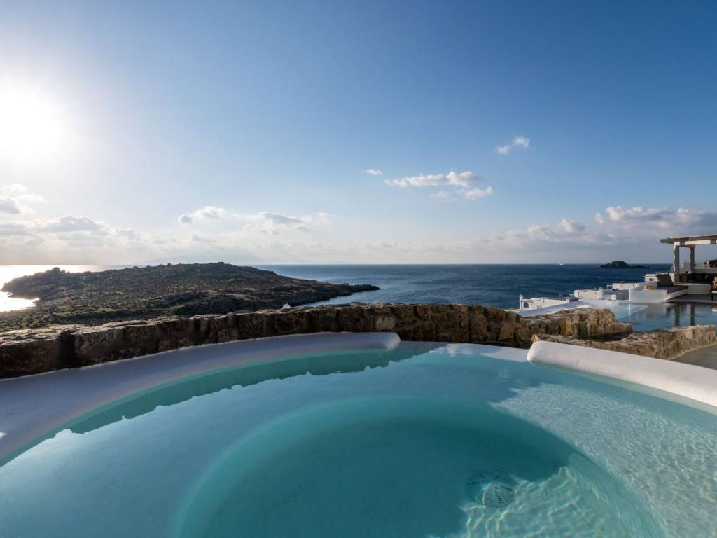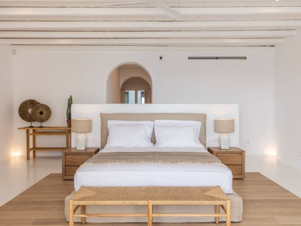 This luxurious villa is located in the Cavo Glyfadi area of Aleomandra, Mykonos. The residence offers stunning sea views and panoramic sunsets, set on a 1,000 sq.m. plot with approximately 710 sq.m. of built space. The property features an expansive swimming pool with jacuzzi, sun-drenched terraces, an open-air bar, shaded seating and dining areas, and a barbecue corner. Due to the hillside location, the villa extends over two levels. The interior combines Mediterranean charm with elegant, contemporary design. The ground floor includes five master bedrooms with direct access to wellness amenities such as a steam room (“hammam”) and a gym. Additional facilities on this level include a laundry room, an en-suite bedroom for service personnel, and independent staff quarters. The first floor houses an open-plan living and dining area, a fully equipped modern kitchen, a master bedroom, and a guest toilet. High-quality finishes and thoughtful details are present throughout, including wooden-plank ceilings, oak flooring, a lift, an alarm system, pre-installation for CCTV, and a solar water heating system. This villa combines refined design, luxury, and functional planning, offering privacy, comfort, and spectacular views while integrating seamlessly with the Aleomandra coastline. The unique beauty and appeal of Mykonos island are palpable from the very first moment onwards. Its majestic rolling topography and its unbeatable Cycladic backdrop set the island among the most sought-after destinations worldwide. Mykonos is one of the trendiest islands globally since it blends superbly bustling and hustling cosmopolitan areas with urban life and vivid nightlife, with romantic and idyllic remote lodges for homelovers. The sunny Cycladic plateau of the island exceeds all year round while the Myconian scenery provokes various leisure challenges. It is composed of picturesque bays, such as Ornos, with glitteringly white beaches and turquoise Aegean Sea waters that boast a panoramic outlook of the islets “Delos” and “Rheneia”. On top of that the majority of the bays of Mykonos constitute a frequent anchorage of many boats and yachts for those who would rather a more developed resort atmosphere. Mykonos is an “international cradle” and “multi-cultural meeting point” for fashion trends, artistic and social movements, and business jet-set. Mykonos is just two and a half hours flight from central Europe and some twenty-five minutes flight from Athens. Last but not least it belongs among the top destinations for return of investment within the Mediterranean region.