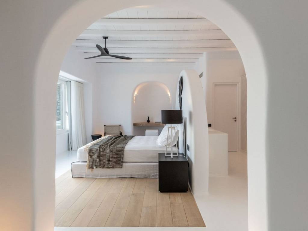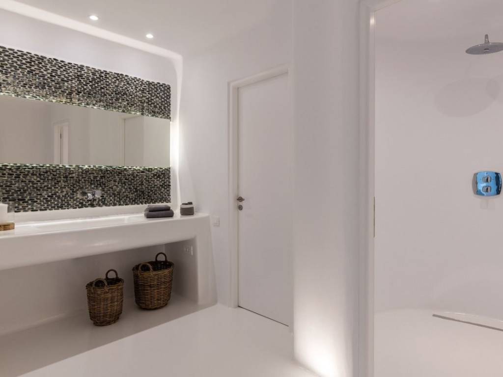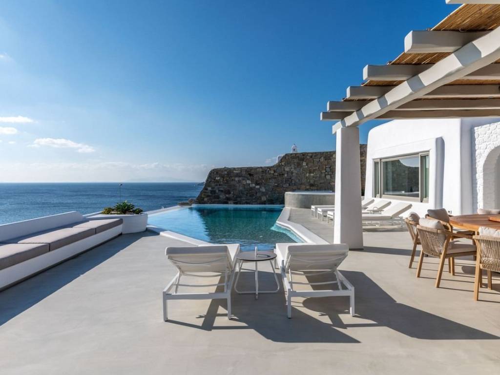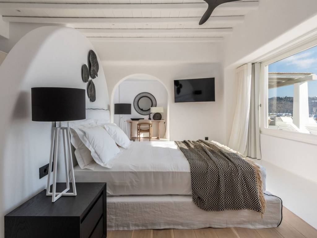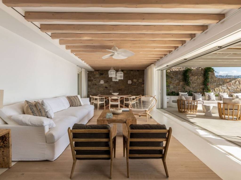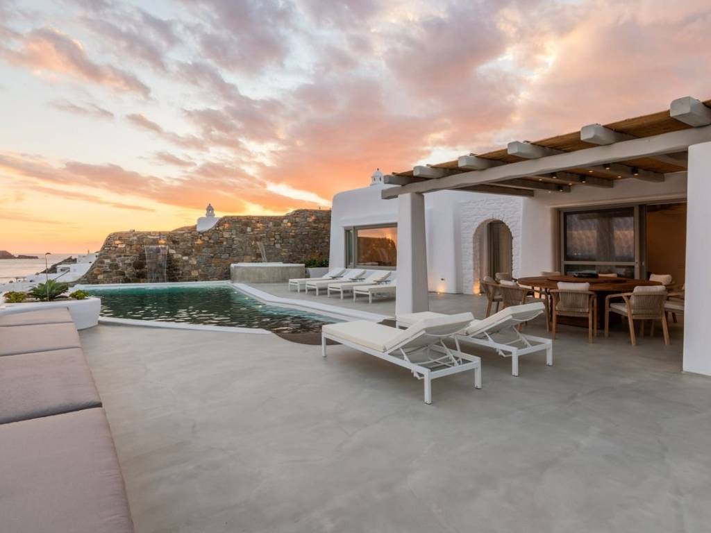 This luxurious villa is located in the Cavo Glyfadi area of Aleomandra, Mykonos. The residence offers stunning sea views and panoramic sunsets, set on a 1,000 sq.m. plot with approximately 710 sq.m. of built space. The property features an expansive swimming pool with jacuzzi, sun-drenched terraces, an open-air bar, shaded seating and dining areas, and a barbecue corner. Due to the hillside location, the villa extends over two levels. The interior combines Mediterranean charm with elegant, contemporary design. The ground floor includes five master bedrooms with direct access to wellness amenities such as a steam room (“hammam”) and a gym. Additional facilities on this level include a laundry room, an en-suite bedroom for service personnel, and independent staff quarters. The first floor houses an open-plan living and dining area, a fully equipped modern kitchen, a master bedroom, and a guest toilet. High-quality finishes and thoughtful details are present throughout, including wooden-plank ceilings, oak flooring, a lift, an alarm system, pre-installation for CCTV, and a solar water heating system. This villa combines refined design, luxury, and functional planning, offering privacy, comfort, and spectacular views while integrating seamlessly with the Aleomandra coastline. The unique beauty and appeal of Mykonos island are palpable from the very first moment onwards. Its majestic rolling topography and its unbeatable Cycladic backdrop set the island among the most sought-after destinations worldwide. Mykonos is one of the trendiest islands globally since it blends superbly bustling and hustling cosmopolitan areas with urban life and vivid nightlife, with romantic and idyllic remote lodges for homelovers. The sunny Cycladic plateau of the island exceeds all year round while the Myconian scenery provokes various leisure challenges. It is composed of picturesque bays, such as Ornos, with glitteringly white beaches and turquoise Aegean Sea waters that boast a panoramic outlook of the islets “Delos” and “Rheneia”. On top of that the majority of the bays of Mykonos constitute a frequent anchorage of many boats and yachts for those who would rather a more developed resort atmosphere. Mykonos is an “international cradle” and “multi-cultural meeting point” for fashion trends, artistic and social movements, and business jet-set. Mykonos is just two and a half hours flight from central Europe and some twenty-five minutes flight from Athens. Last but not least it belongs among the top destinations for return of investment within the Mediterranean region.
