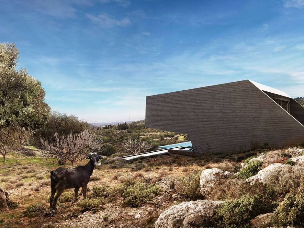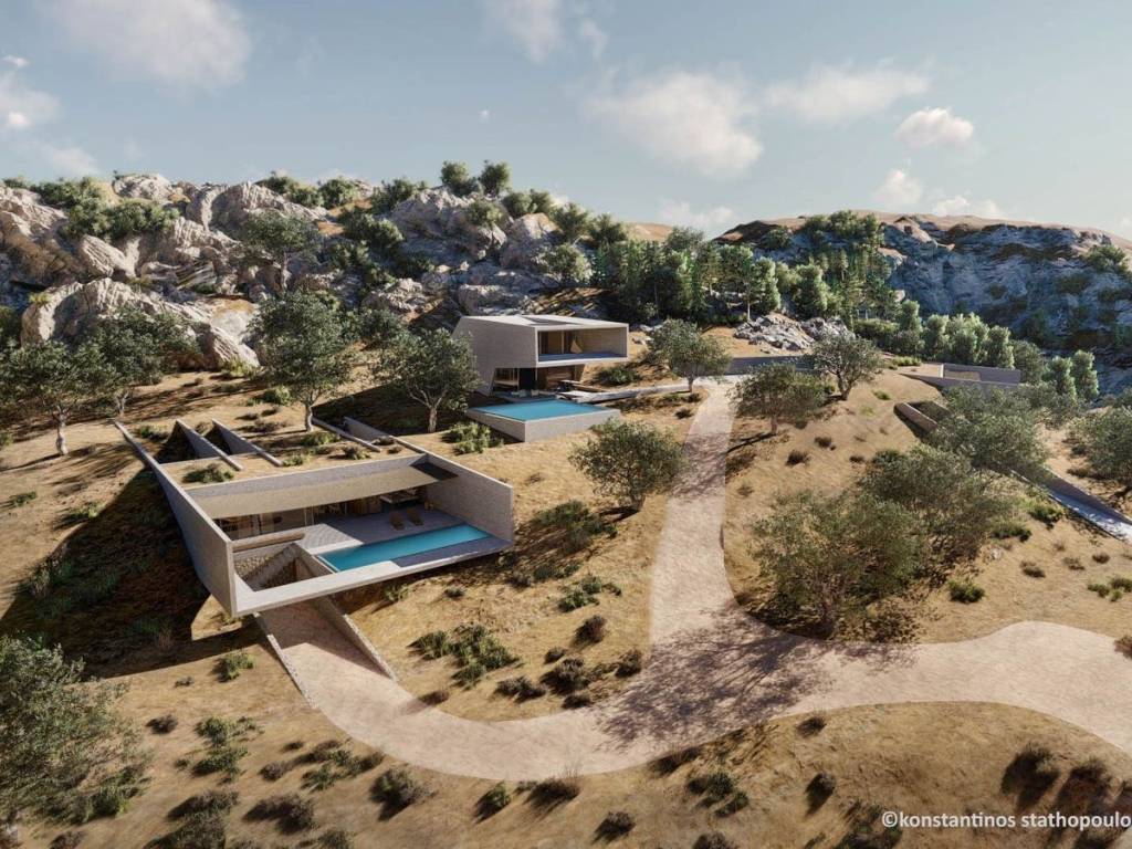 In traditional architecture, the compositional logic emerges from an additive approach, where buildings lean on one another, gradually forming a “multi-cellular organism”, a settlement. In the landscape, however, one rarely encounters isolated residences, especially of a vertical nature; only churches and windmills break the horizon in this manner. The main interventions in the landscape involve grain or livestock storage buildings and technical structures, often spread horizontally, delineating boundaries. The retaining walls found in technical works and the light shading structures common in anonymous architecture served as the main conceptual tools in the design. The alignment of walls towards the view becomes the first symbolic and abstract gesture, marking the creation of an artificial boundary and the presence of human intervention. Following the slope, the walls “roll” towards the view, framing it. The placement of the three residences is such that they follow the curvature of the elevation, opening toward the view and descending in an organic layout. The architectural development of Residences A and C is topographic, the exposed concrete walls emerge as traces in the landscape and evolve into retaining walls, defining the enclosed spaces and the outdoor arrangements with a light shading mesh. The composition of spaces is symbolically represented by an inverted greek letter “Π”, a “life pot”. Residence B rises at the foot of the hill; two parallel walls emerge from the ground at an angle, ascending. An artificial rock is formed, leaning towards the view, reminiscent of the local goats standing on the hillside. The outcome is highlighted by the intense Greek light, merging with the landscape to create a unified environment, with distinct characteristics and harmonized spaces of living and vegetation. The arrangement of openings contributes to the feeling of the residence as a spiritual sanctuary, offering ample light, cooling, and a connection to the surrounding natural beauty. Nature unfolds before the user, following the imagined path of light. A unique play of light and shadow is created, offering distinct experiences throughout the day as the position and intensity of the sun change. Location: From Faliraki then inland to Kalithies, the road leads to the village of Psinthos. Unique features: Walking routes in the nearby Valley of the Butterflies nature reserve pass through sweetgum forest, where thousands of butterflies gather between late May and August. Accessibility: 23km from Rhodes town with a local bus running regularly. Investment potential: The idea of owning a property in the countryside yet still just minutes from the sea is becoming increasingly attractive.