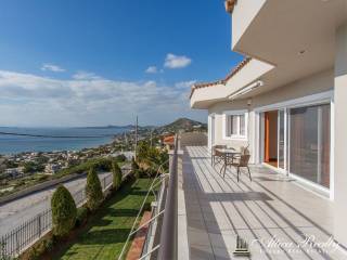 Three levels luxury villa of 550 sq.m. on a plot of 2.000 sq.m. on two levels. It has two apartments on the ground floor. On the 1st floor there is a bedroom, living room, dining room with fireplace and kitchen. On the 2nd floor there are 4 bedrooms and one bathroom. All floors are connected by stairs and elevator. In the courtyard there is a BBQ area with a wooden roof, and a shower. In the surrounding area there is a swimming pool (5.5 x 12 = 66 m²) Facilities include a solar water heater, alarm system, security doors and oil heating facilities. The villa is located on a hill with wonderful sea views.