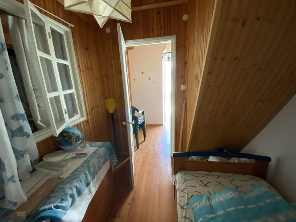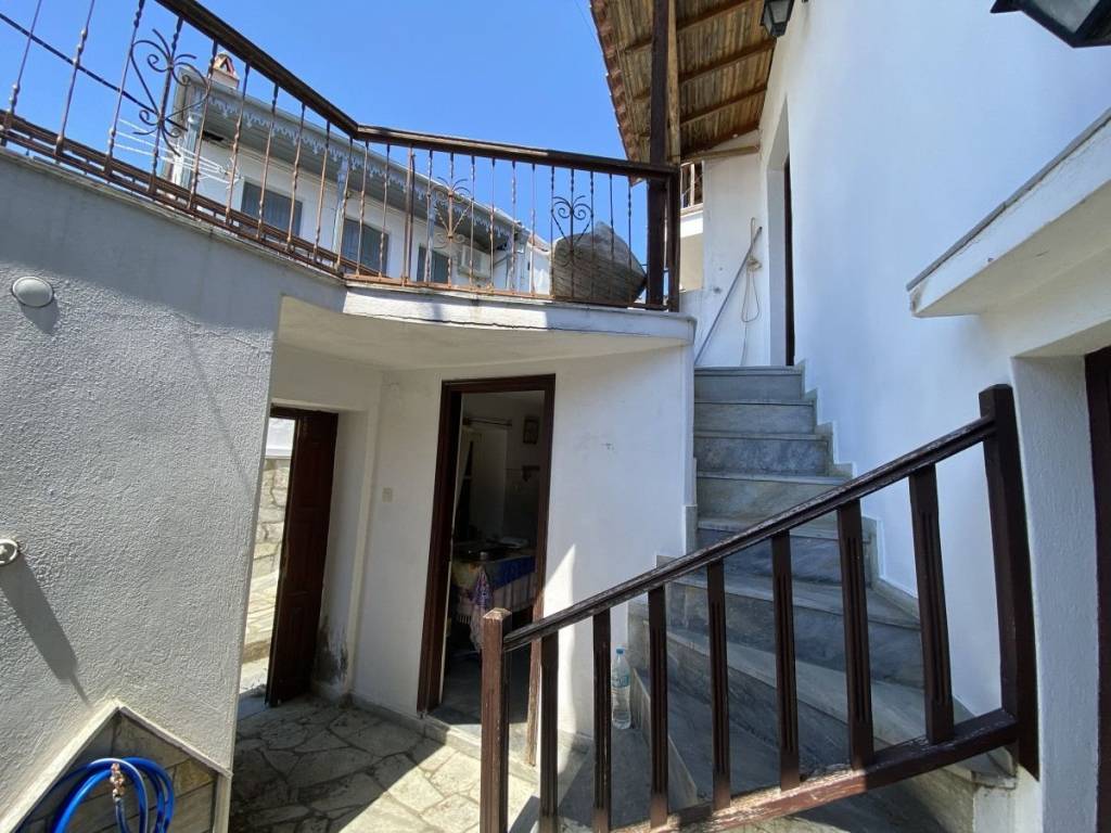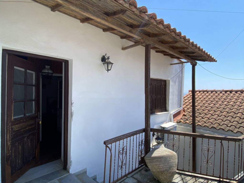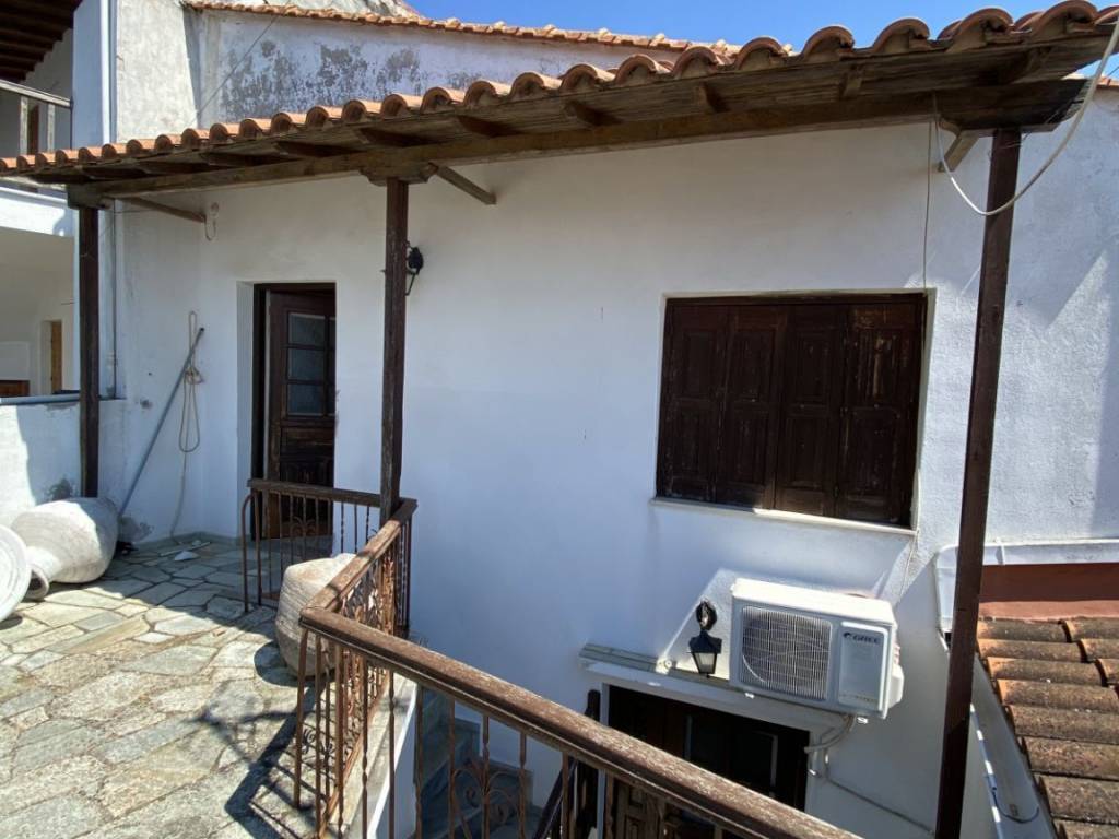 Two-level residence in Glossa, Skopelos with 114 sq.m. living areas. Ground floor includes an apartment consisting of a kitchen/living room, a bedroom and a bathroom-w.c. (47 sq.m. total). In the first floor, there is a separate apartment with a kitchen-living room, a bedroom, a bathroom (35 sq.m.) and a balcony facing the adjacent street. An attic/mezzanine floor of 35 sq.m. areas is also part of the property. Balconies from the ground floor and from the 1st floor level offer distant view to the sea. It is situated in a land plot of 52,1 sq.m. Vertical distance is approximately 700 m. from the sea and 3.5 km. from Loutraki Marina. The distance from Skopelos main port is 12 km. Residence is in average condition and requires to be renovated.