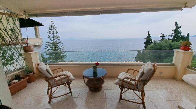 CORFU For Sale a fantastic villa situated in Perama close to the Achilleion palace, just 30 meters away from the beach with a beautiful garden and spectacular views to sea and the mountains. It is a 263 sq m, three storey house build in 2004-2012 in a plot of 1168 sq m which extends to the beach with 177 sq m more (this part is separated by the road). Located only (approx) 10 minutes from the center of Corfu town and the airport. It consists of three levels (ground floor, maisonette and loft: Ground Floor (80 sq m): Consists of one bedroom, 1 bathroom, fully equipped kitchen, living room with fire place, double glazing, air condition and central heating. Maisonette (154 sq m): it consists of three bedrooms (one master bedroom), two bathrooms (one with jacuzzi), an open space fully equipped kitchen, living room with two fire places, double glazing, central heating, air conditions and big verandas 48 sq m. Loft (29 sq m): specially designed, comfortable with panoramic viws and central heating.