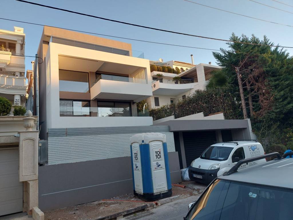 Luxury villa located in a quiet neighborhood in Panorama Voula, south oriented, at 29 Skra street. The residence features a spacious design with with 432 sqm of elegant living space spread across the ground, first, second and third floor situated on a 360 sqm plot. The property also features an additional 181 sqm of thoughtfully designed auxiliary space. In total the building measures 613 sqm. Exterior space includes 160 sqm of greenery, a 9X3,45 mm swimming pool, veranda and staircases leading to the main entrance. First floor (level +4.30) consists of living room, an impressive double - height ceiling dining space and a kitchen. Assending to the 2nd floor (level +7.30) there is a second sitting room and a master bedroom. Top floor (level +10.20) consists of a spacious master bedroom, measuring an impressive 60 sqm space with unlimited view to the Saronic Gulf as well as one more master bedroom. On the ground floor, at the pool level (+1.20) there is a family room, one more spacious bedroom, maids room, laundry, kitchen, and two bathrooms. Part of this level may also be used as an independent apartment. The construction follows all modern practices both in terms of construction and the use of high quality materials. The building is of category A++ and the shell and roof are insulated for a minimal energy footprint. The frames of the house are manufactured based on the SUPREME S700 series of the ALUMIL company with anti-vandal glass panels for high strength and thermal insulation. The floors and staircase will be oak internally, except for the ground floor where they will be made of large-sized tiles both internally and externally. The bathrooms will be tiled with 1.20X2.80 slabs of excellent quality from well-known Italian companies (kronos ceramiche). Regarding the electromechanical installations of the residence, the following has been installed: Hydraulic elevator for seven people, five stations, with automatic doors. 10 KWp photovoltaic system on the building's sloping roof. DAIKIN VRV cooling - heating system with one outdoor unit and seven indoor air conditioning units installed in the false ceilings of the two-story spaces with easy access through inspection hatches for easy maintenance. The system allows the temperature of each space to be regulated independently with a separate thermostat. DAIKIN heat pump for operating an underfloor heating system with independent temperature selection for each room. Domestic hot water is also produced by a DAIKIN heat pump device and an INDOOR unit located in the mechanical installation area of ​​the residence. A three phase 220/380 V network is made with a separate panel per floor and a general panel in the basement. Alarm system with detectors and cameras in all indoor and outdoor areas. Fire detection network, video door phone monitor on each floor, R/TV/SAT networks, telephones, WiFi, DATA, etc. Please note that the publication of the advertisement on any Internet site without the owner's permission is prohibited.