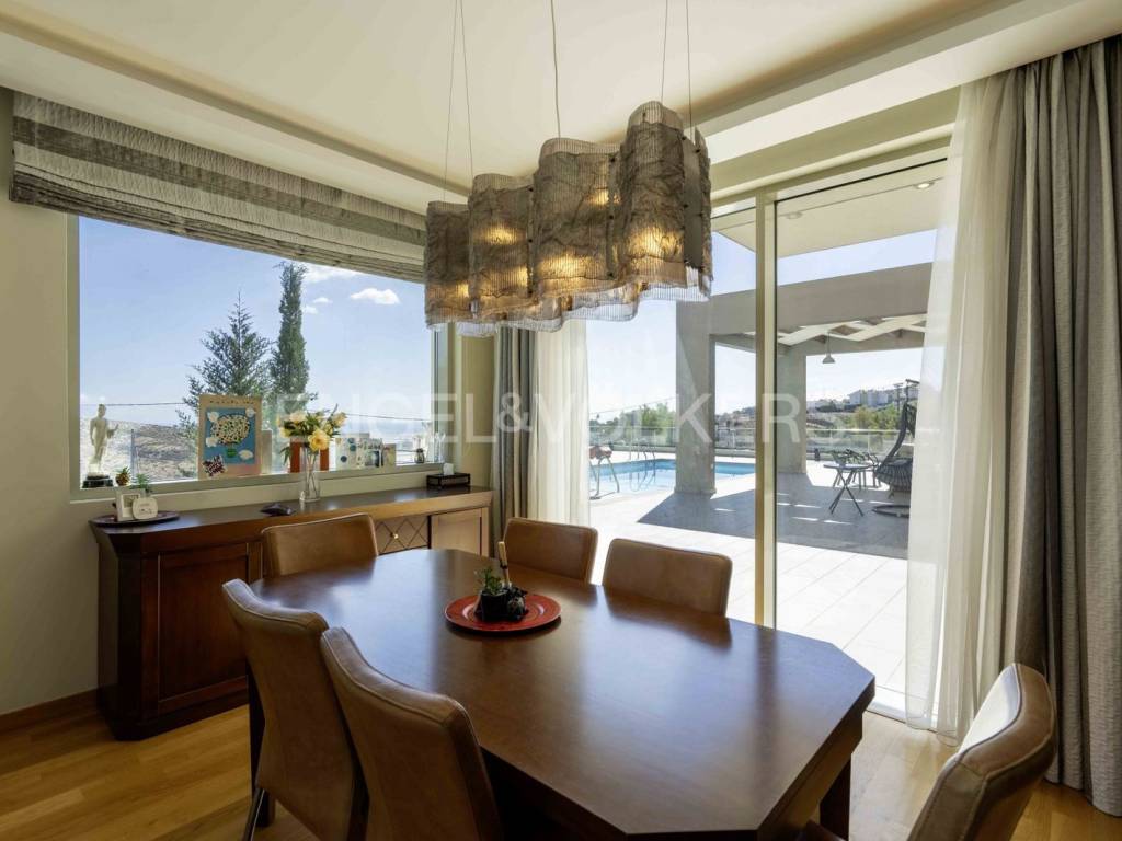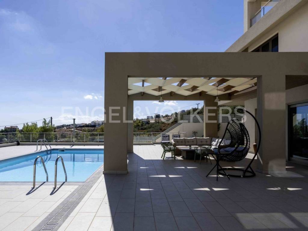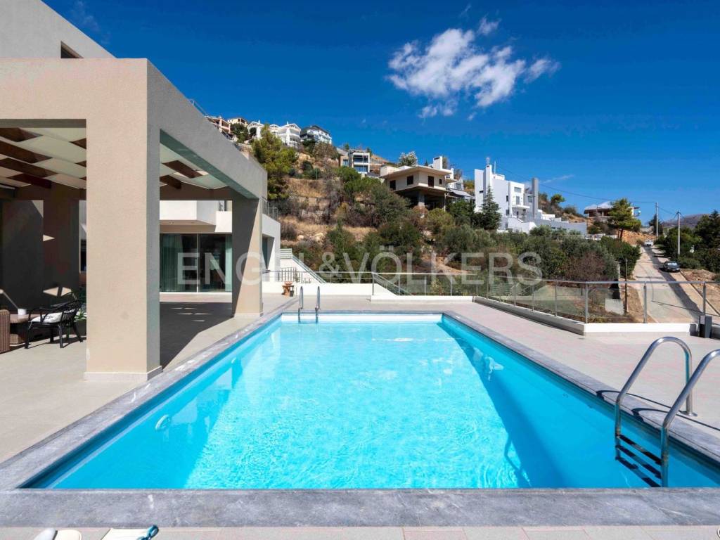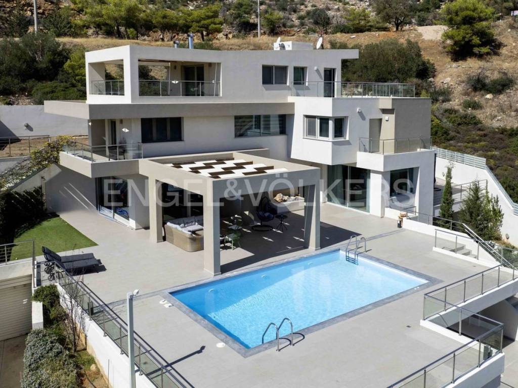This exceptional 455 sq.m. single-family home, built in 2013 on a 1,325 sq.m. sloping plot, boasts a minimalistic aesthetic and unique character with unobstructed views. The main residence is spread over three levels, all serviced by a modern hydraulic elevator. The ground floor (128 sq.m.) features spacious, bright areas that include a large living room with an elegant fireplace, a dining area, and a WC. The independent kitchen, designed to high functionality standards, provides direct access to the outdoor area. The first floor (121 sq.m.) consists of 3 comfortable bedrooms with ample storage space, 2 spacious, modern bathrooms equipped with top-quality materials, and a laundry room. On the top floor, there is a spacious office, which can easily be converted into an additional bedroom, with direct access to a large terrace with a pergola and beautiful views. The basement, located at garden level, features an independent 85 sq.m. apartment, ideal for hosting guests or accommodating staff. This apartment includes 2 master bedrooms, a comfortable living area, and a fully equipped kitchen. On the same level, there is a large garage with 4 parking spaces, 4 storage rooms, and a gym. The outdoor space, with its BBQ area, carefully designed garden, and large 40 sq.m. swimming pool, is a true paradise, offering unforgettable moments of relaxation. This home stands out for its refined aesthetics and the use of high-quality materials throughout. Features include wooden floors, heavy-duty frames with bulletproof windows on the ground floor, modern security systems, a power generator, external thermal insulation, underfloor heating with zone control, and a central VRV air conditioning system. *The Energy Performance Certificate is currently being issued Drafi is one of the most beautiful and green suburbs of Attica, built on the southeastern foothills of Penteli. With an excellent layout and unique views, it is an ideal place to live, combining a refreshing green area with large streets and luxury houses. A pole of attraction for lovers of nature, hiking and the waterfall on Achaion Street, just 50 meters from the main road. The area has experienced great residential development in recent years due to its excellent location which gives easy access to central commercial points, Attiki Odos and the Metro, El.Venizelos airport and the port of Rafina. A stone's throw from the beaches of southeast Attica. It is characterized as a "Model State" and offers a high level of living and comfort.