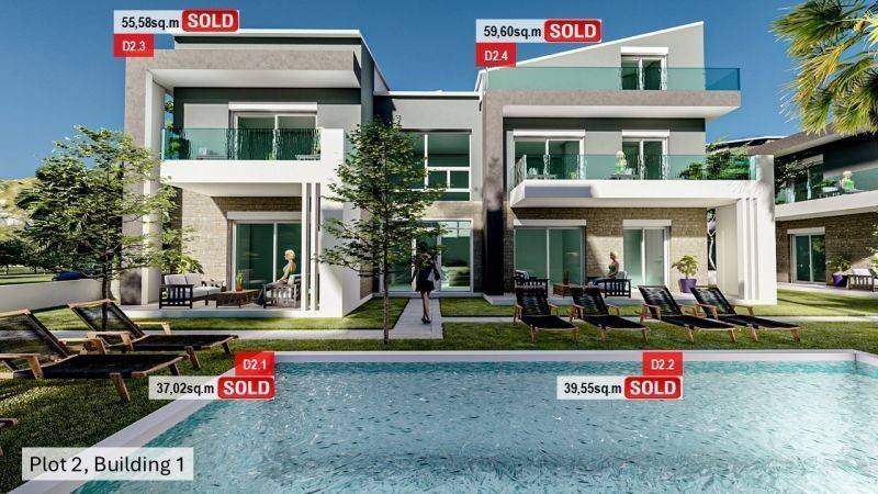 The exteriors are dominated by greenery, with well-maintained gardens full of trees and tasteful planting, which help the complex to harmonize with the natural environment. Communal swimming pools are also placed, giving the opportunity for additional entertainment.