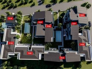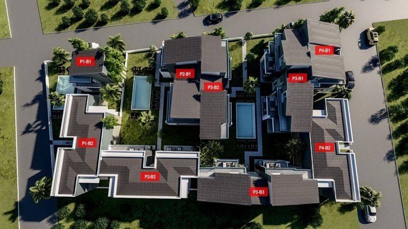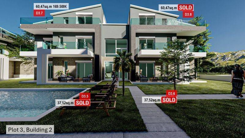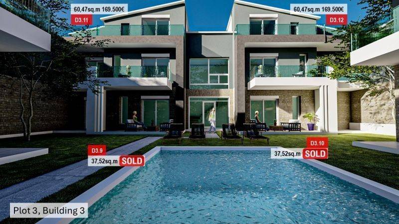 The exteriors are dominated by greenery, with well-maintained gardens full of trees and tasteful planting, which help the complex to harmonize with the natural environment. Communal swimming pools are also placed, giving the opportunity for additional entertainment.