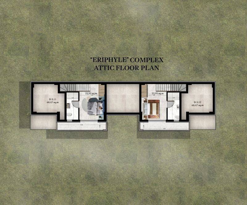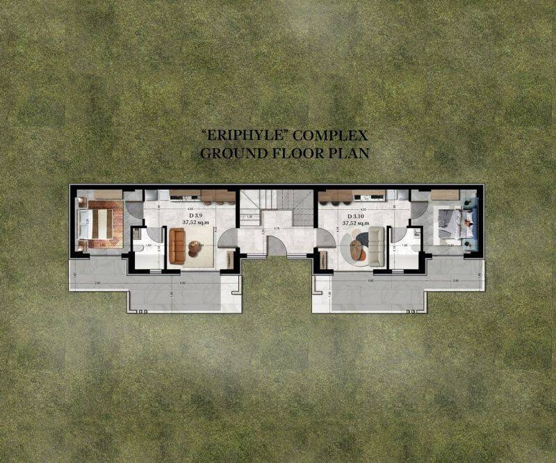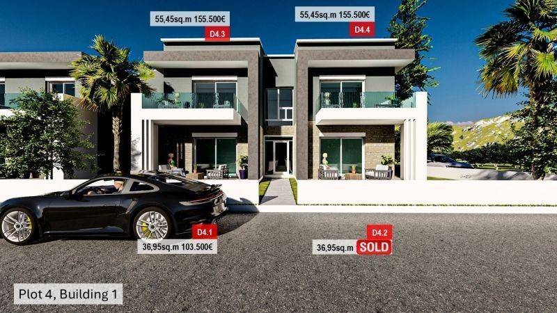• 11 Ground floor apartments from 36.95sq.m. to 39.55sq.m., consisting of a living room with kitchen, 1 bedroom, 1 bathroom.