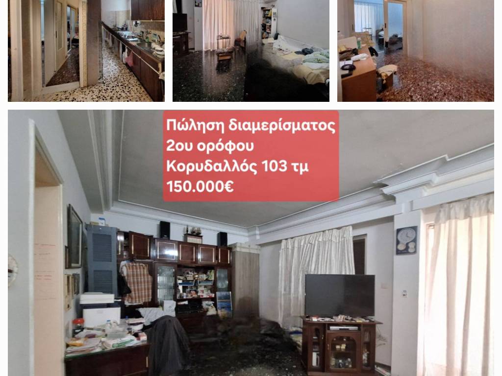 (ENG) Second-floor apartment, 103 sq.m., featuring 2 bedrooms, a separate kitchen, and a spacious living room. It offers air conditioning (A/C) in all areas, as well as an internal space that can be used as a storage room or home office. Additionally, it includes a large entrance hall and two balconies (one large and one small). The apartment is functional; however, renovation would be beneficial. It has central oil heating (currently not in use) and an elevator, which has not been operating in recent years. Located at Agios Georgios Square in Korydallos, approximately 5 minutes from Korydallos Metro Station (Eleftherias Square). Price: €150,000 Contact phone: +30 6949207897 Note: The property is NOT furnished.