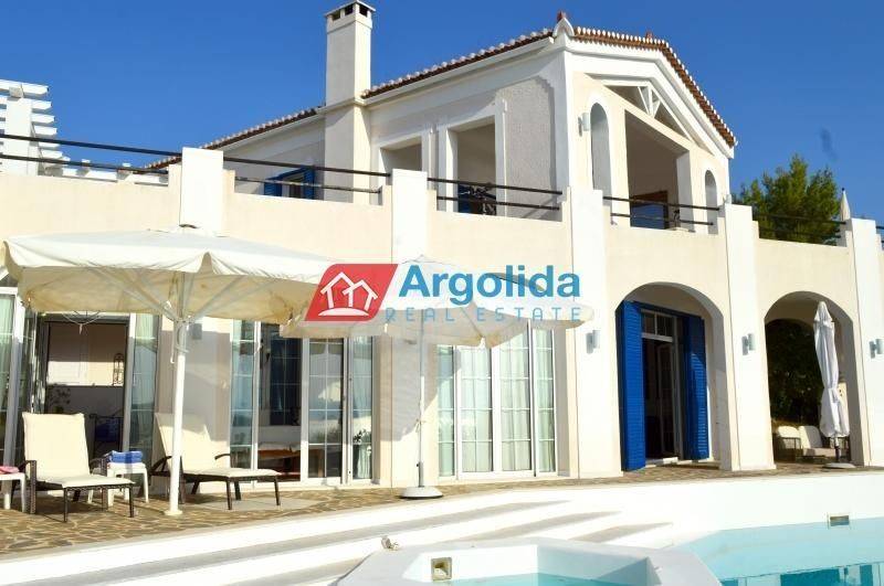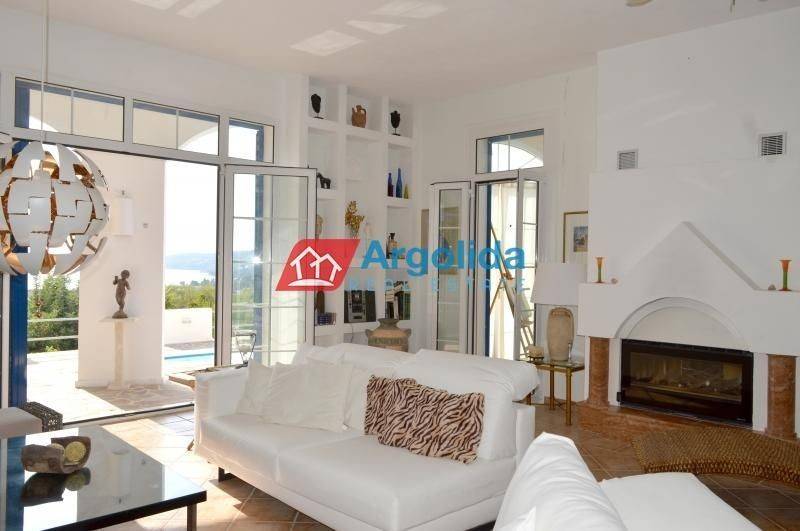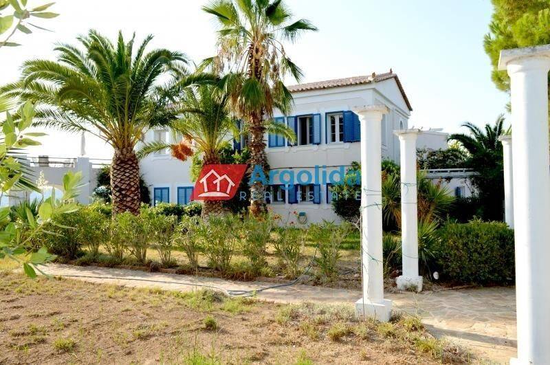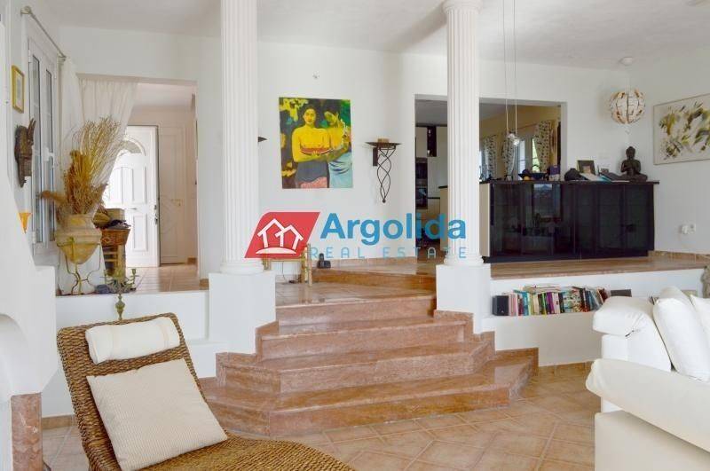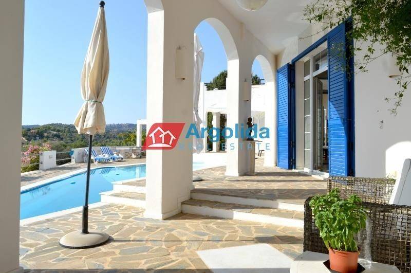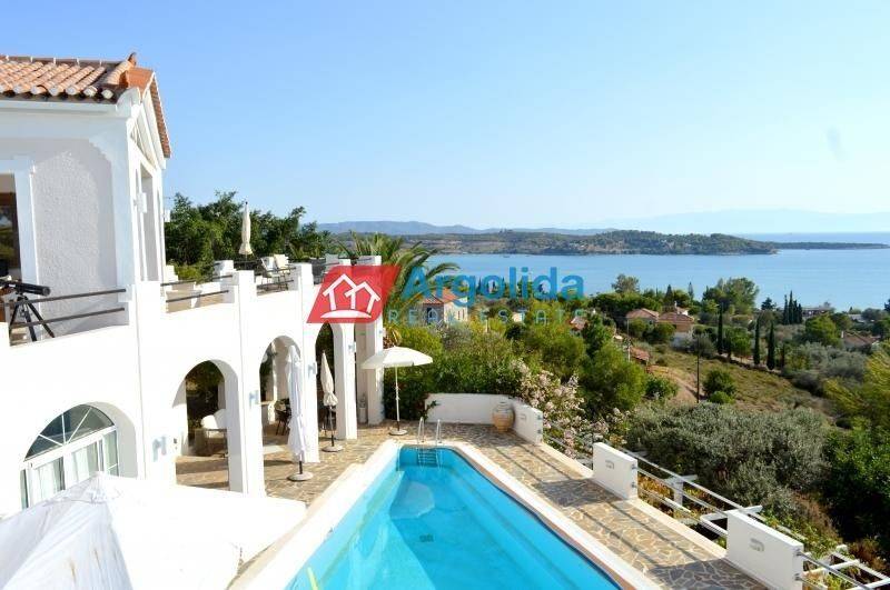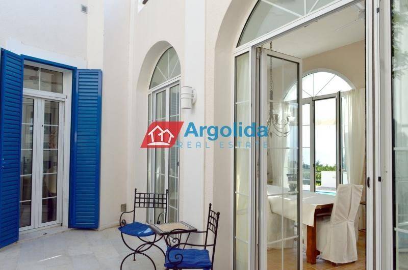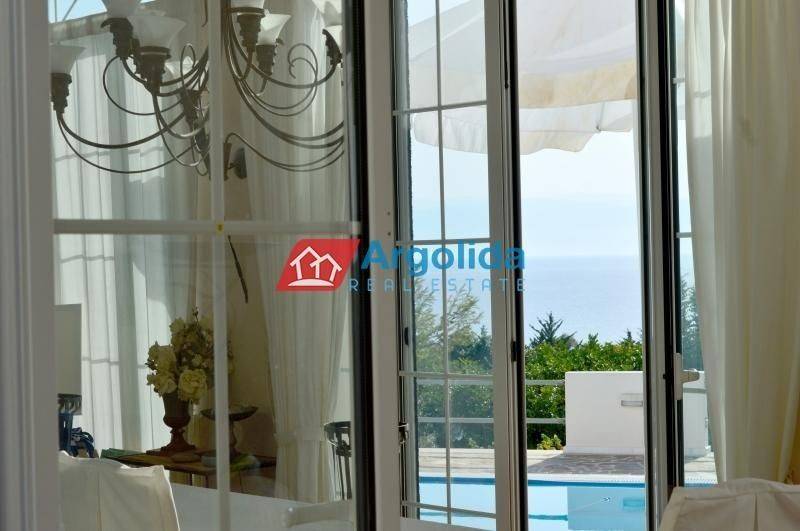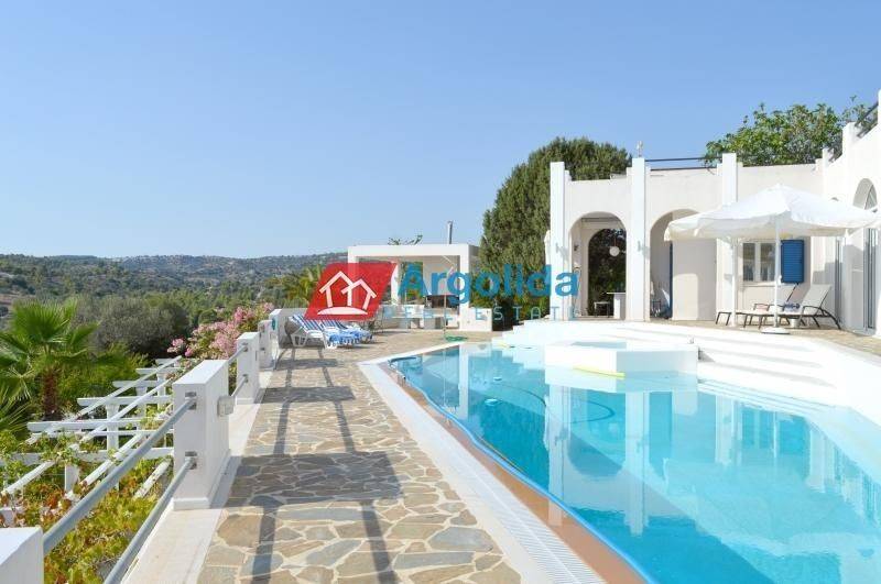 Inspired by Greco-Roman architecture, this 250 m² villa, close to the sea, is built on a hillside overlooking the sea and the Argolic Gulf and Spetses Island and spectacular views as far as the Taygetos mountains. It was designed and built for indulgent relaxation immersed in total luxury. The entrance level ground floor has an impressive entrance opening onto a spacious open plan living space with fireplace. The designer kitchen and dining stoa lead off this area. There is a spacious bedroom, bathroom and office space on this level. The autonomous 40 m² one-bedroom guest apartment with its own kitchen and bathroom opens onto an intimate enclosed courtyard. A wide marble staircase leads upstairs to the master suite. With its own fireplace and ensuite bathroom complete with jacuzzi, walk-in wardrobes and opening on to expansive balconies with a sheltered outdoor sitting room; the master suite is a haven in its own right. The impressive pool is designed for maximum views and enjoyment including an adjoining outdoor sitting room with its own fireplace and various other dining areas and sitting nooks. Apart from a two car garage, shaded parking space has been assigned for up to four extra vehicles. The balance of the grounds has been landscaped with an eye to Mediterranean influence. The watering requirements of the herbs, plants, shrubs, palm trees, and lawns are serviced by the property’s own well (water supply.) Every element of this exclusive property has been carefully curated for absolute comfort, enjoyment, and relaxation. This is a unique property which combines elegance and privacy.
