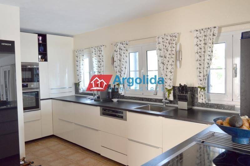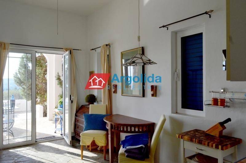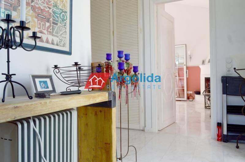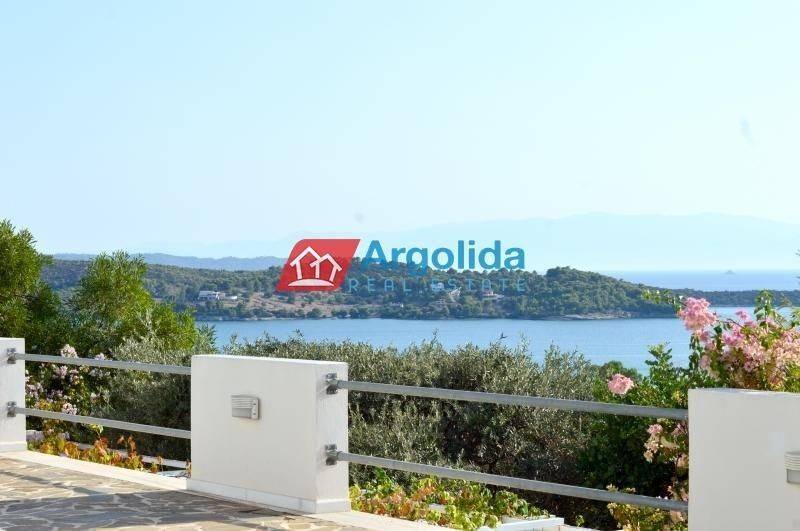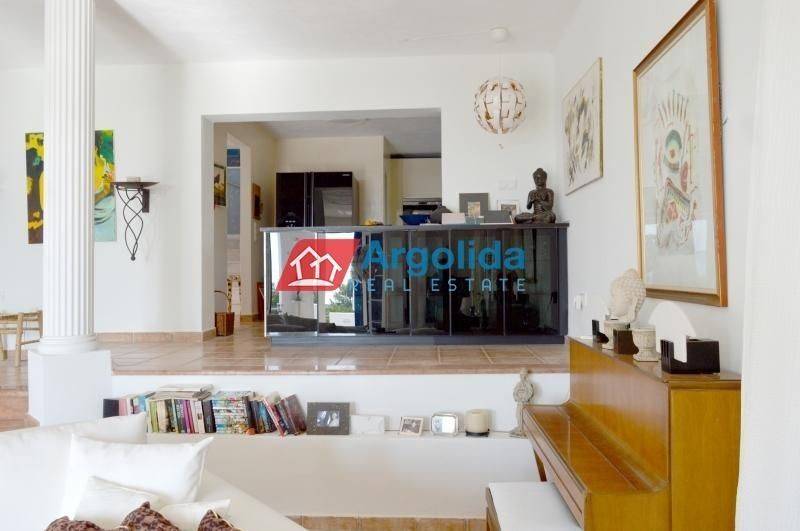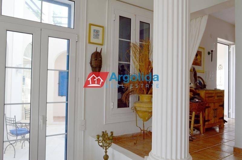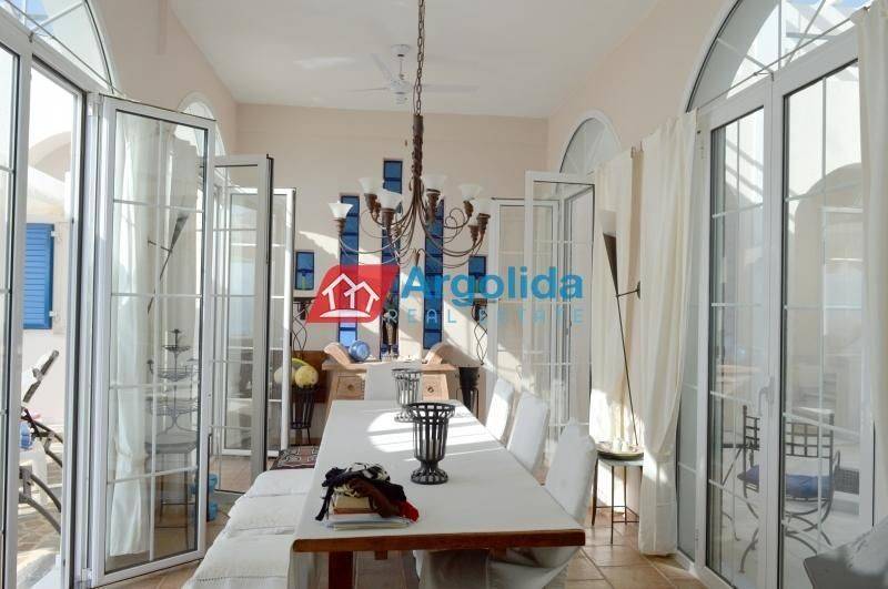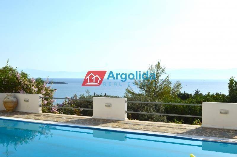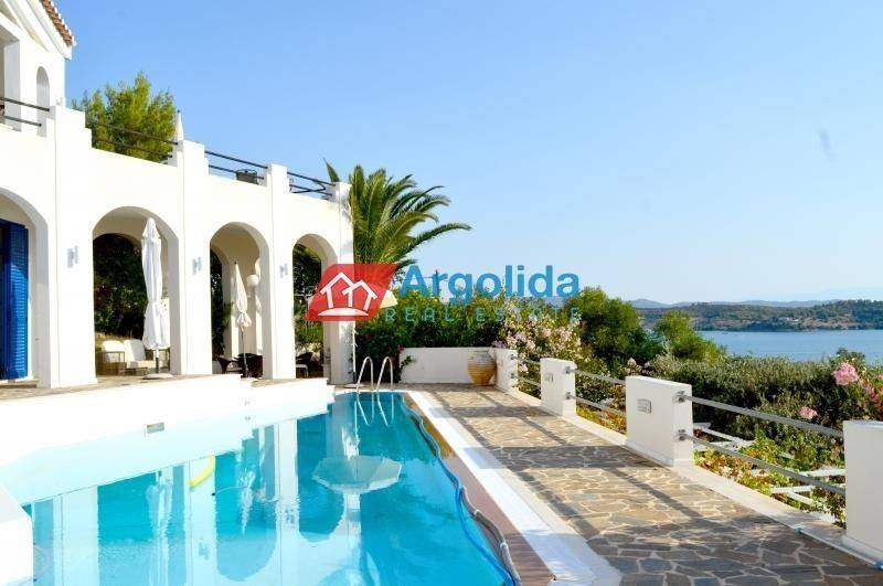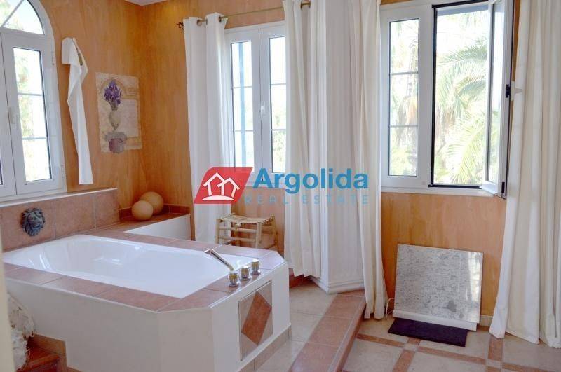 Inspired by Greco-Roman architecture, this 250 m² villa, close to the sea, is built on a hillside overlooking the sea and the Argolic Gulf and Spetses Island and spectacular views as far as the Taygetos mountains. It was designed and built for indulgent relaxation immersed in total luxury. The entrance level ground floor has an impressive entrance opening onto a spacious open plan living space with fireplace. The designer kitchen and dining stoa lead off this area. There is a spacious bedroom, bathroom and office space on this level. The autonomous 40 m² one-bedroom guest apartment with its own kitchen and bathroom opens onto an intimate enclosed courtyard. A wide marble staircase leads upstairs to the master suite. With its own fireplace and ensuite bathroom complete with jacuzzi, walk-in wardrobes and opening on to expansive balconies with a sheltered outdoor sitting room; the master suite is a haven in its own right. The impressive pool is designed for maximum views and enjoyment including an adjoining outdoor sitting room with its own fireplace and various other dining areas and sitting nooks. Apart from a two car garage, shaded parking space has been assigned for up to four extra vehicles. The balance of the grounds has been landscaped with an eye to Mediterranean influence. The watering requirements of the herbs, plants, shrubs, palm trees, and lawns are serviced by the property’s own well (water supply.) Every element of this exclusive property has been carefully curated for absolute comfort, enjoyment, and relaxation. This is a unique property which combines elegance and privacy.