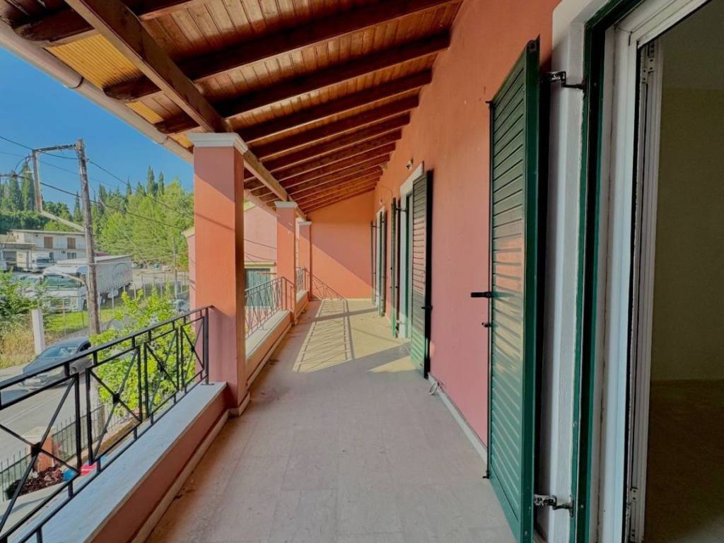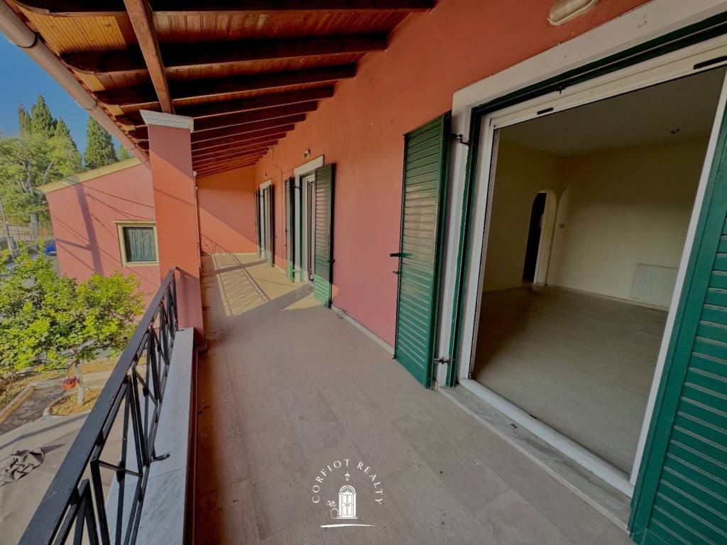 Situated in the Alepou area, this bright and well-connected 2-bedroom apartment offers a comfortable layout, excellent outdoor spaces, and a prime location just a short drive from Corfu Town. With direct access from the main road and a bus stop right at your doorstep, getting around the island is easy—whether you’re heading into town or to one of the nearby beaches like Glyfada and Kontogialos. The layout is thoughtfully arranged to separate living and private areas while maximizing natural light. Upon entering, you step into a small entrance hall that leads straight ahead into the main living area—an airy space that extends to your left and opens directly onto a large front-facing terrace. This terrace is also shared by both bedrooms, offering a seamless indoor-outdoor feel across the front side of the apartment. Continuing through the hallway, you’ll find the bathroom to your right, followed by a separate kitchen at the end of the corridor, which also enjoys its own private balcony. The first bedroom is located to the left, and the second—slightly larger—is directly in front. Both bedrooms are equipped with generous built-in storage. The apartment is fitted with central heating, making it suitable for year-round living. Whether you’re looking for a primary residence close to Corfu Town or a conveniently located home with excellent access to both the city and the coast, this property combines practical design with a highly desirable location.
