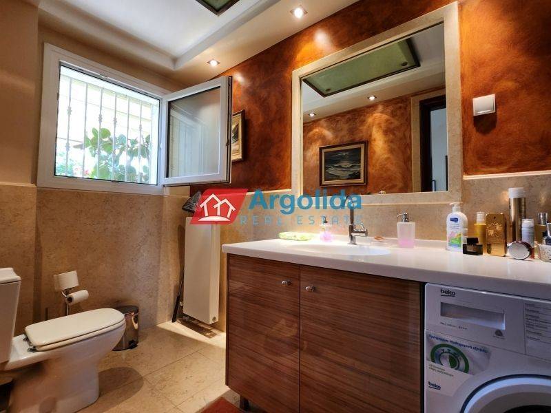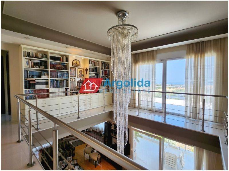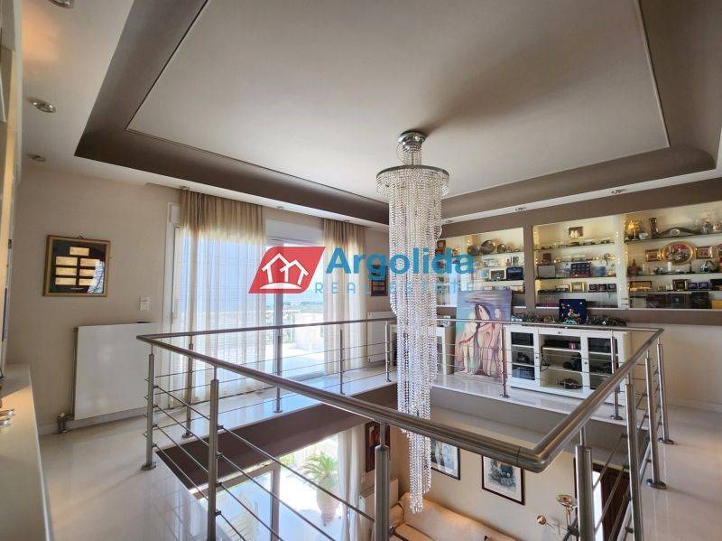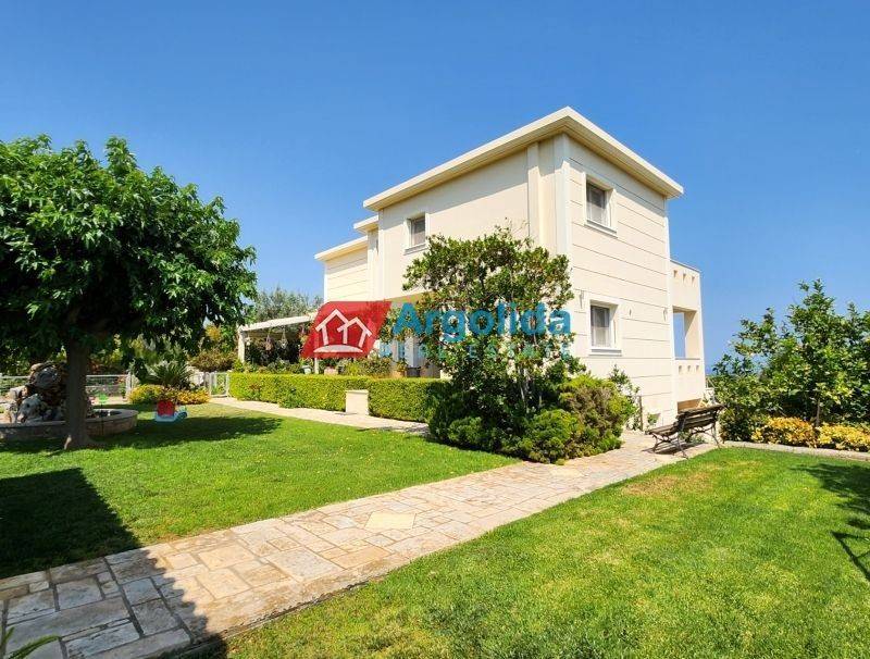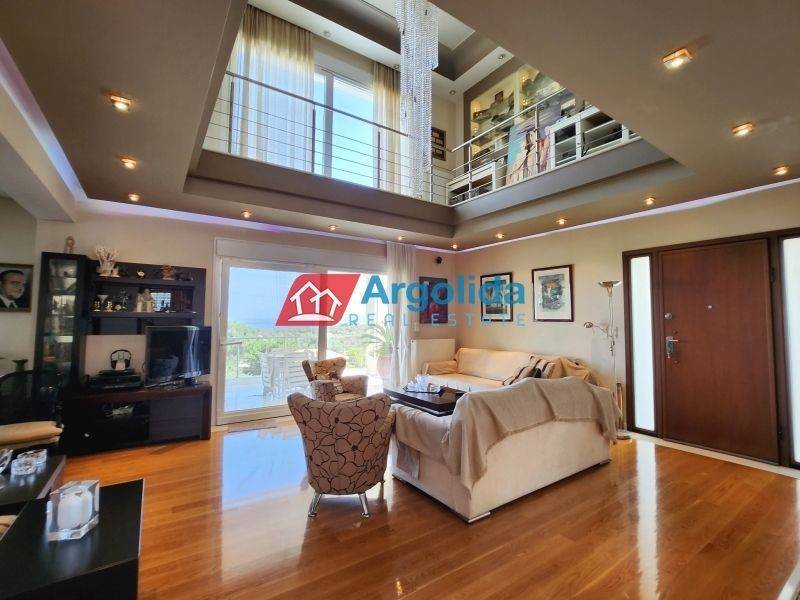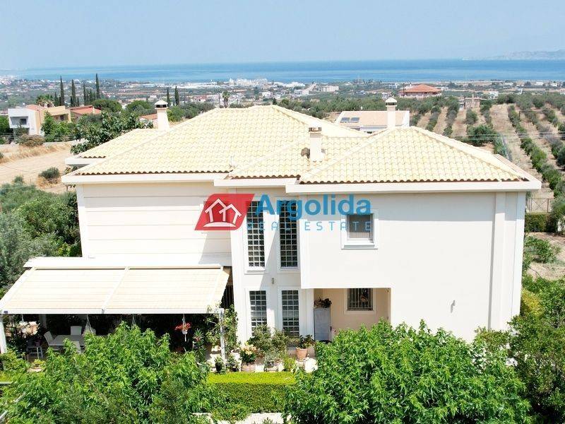 In a privileged location in Ancient Corinth, a luxurious three-level detached house of total area 422 sq.m. is for sale, situated on a privately owned plot of 7,000 sq.m. with stunning, unobstructed views of the Corinthian Gulf and the historic Castle of Ancient Corinth. The property consists of a main residence of 220 sq.m. on two levels and an independent, fully functional apartment of 70.55 sq.m. in the semi-basement with a separate entrance. The two-level main residence is spread over the ground floor and first floor and includes on the ground floor a large living room with fireplace, lounge, dining room, fully equipped kitchen in a separate space, storage room, and WC. On the first floor, there is a master bedroom with en-suite bathroom and walk-in closet, two additional spacious bedrooms, and an extra bathroom with jacuzzi. The semi-basement features a second living room with kitchen and energy-efficient fireplace, a bedroom, bathroom, as well as a cellar and storage rooms accessible both internally and externally. All floors are connected by an elevator. The property includes covered parking for 3 cars, a 33 sq.m. organized BBQ area with traditional wood-fired oven, an underground water tank of 30 cubic meters, a photovoltaic system that nearly eliminates electricity costs, and a Smart Home system with expandable KNX. Security features include an alarm system and perimeter security cameras. There is also an automatic irrigation system, a landscaped 1,000 sq.m. garden with lawn and fountain, and 6 hectares of productive olive trees. Each room has access to a spacious veranda with unlimited views, while the dining area features an illuminated retractable awning overlooking the castle and the Corinthian Gulf. This is a unique, high-specification residence, ideal both as a main home and for investment purposes. The location is extremely privileged, just a 10-minute walk from the archaeological site of Ancient Corinth, 5 minutes by car from the nearest beach, the Mare West shopping center, and the Corinth Suburban Railway Station. It is 115 km away from Athens International Airport.