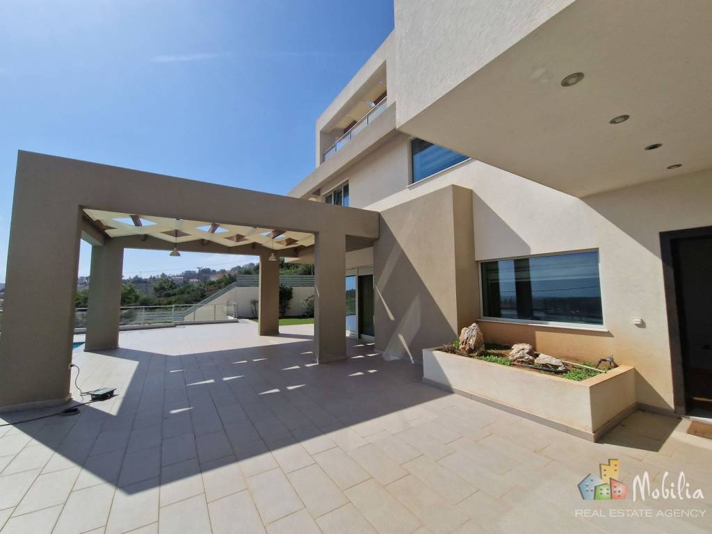 Superb opportunity to acquire this beautiful contemporary villa of 500m2 located in the privileged residential area of Drafi. Modern 500 m² villa with panoramic views all the way to the sea, built in 2013 on a 1,250 m² sloping plot in Drafi. Swimming pool, barbecue area and garden. The villa also includes a guest flat, cellars, a 3-car garage and a gym. It is equipped with top-of-the-range materials such as a hydraulic lift, triple-glazed bullet-proof windows, security system with alarms and cameras, smart house, underfloor heating and VRV air conditioning. The 300 m² main house has 3 levels. On the pool level you will find a living room with a vertical glass wall, separate dining room, separate fitted kitchen with access to the BBQ area and a WC. The first floor comprises a master bedroom with en-suite bathroom and dressing room, a children's bedroom and a smaller bedroom sharing a bathroom and utility room. The top floor houses a large study with its own terrace equipped with a pergola. On the lower level are the garage, two cellars, a sports room, boiler room and the 88 m² flat, which has a living room, open-plan kitchen, two bedrooms, one with a dressing room, and two bathrooms. The villa is a 30-minute drive from Athens, close to major roads and international schools, the international airport and the port of Rafina. The house is rented until 15/7/2026.. Mobilia Real Estate, contact phone: 2107563200, 2107563202, email: info@mobilia.gr, website: www.mobilia.gr