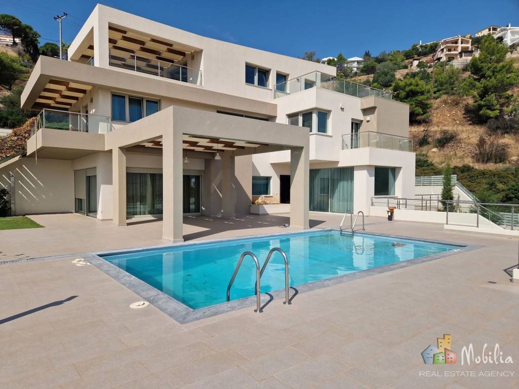Superb opportunity to acquire this beautiful contemporary villa of 500m2, located in the privileged residential area of Drafi. This home, currently rented, will be available from 15/7/2026. This is a minimalist-style villa 500 m², with panoramic views, swimming pool, barbecue area and garden, built in 2013 on a 1,250 m² sloping plot in Drafi. The villa also includes a guest flat, 3 cellars, a gym room and 3-car garage . It is equipped with top-of-the-range materials such as a hydraulic lift, triple-glazed bullet-proof windows, security system with alarms and cameras, smart house, underfloor heating and VRV air conditioning. The 300 m² main house has 3 levels. On the pool level you will find a living room with a vertical glass wall, separate dining room, separate fitted kitchen with access to the BBQ area and a WC. The first floor comprises a master bedroom with en-suite bathroom and dressing room, a children's bedroom and a smaller bedroom sharing a bathroom and utility room. The top floor houses a large study with its own terrace equipped with a pergola. On the lower level are the garage, two cellars, a sports room, boiler room and the 88 m² flat, which has a living room, open-plan kitchen, two bedrooms, one with a dressing room, and two bathrooms. The villa is a 30-minute drive from Athens, close to major roads and international schools, the international airport and the port of Rafina. The house is rented until 15/7/2026.. Mobilia Real Estate, contact phone: 2107563200, 2107563202, email: info@mobilia.gr, website: www.mobilia.gr