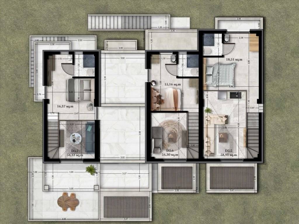 • 10 floor apartments with a loft from 43.53 sq.m. to 58.91 sq.m. consisting of a living room with kitchenette, two bedrooms and two bathrooms.
