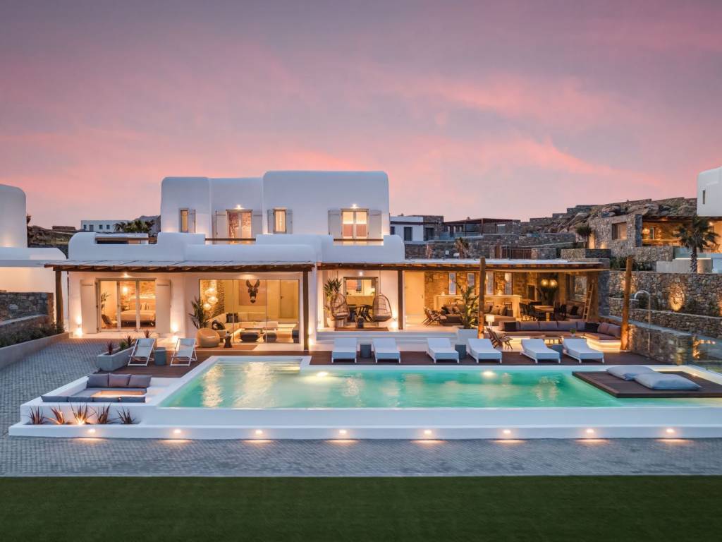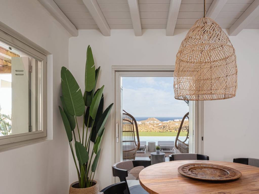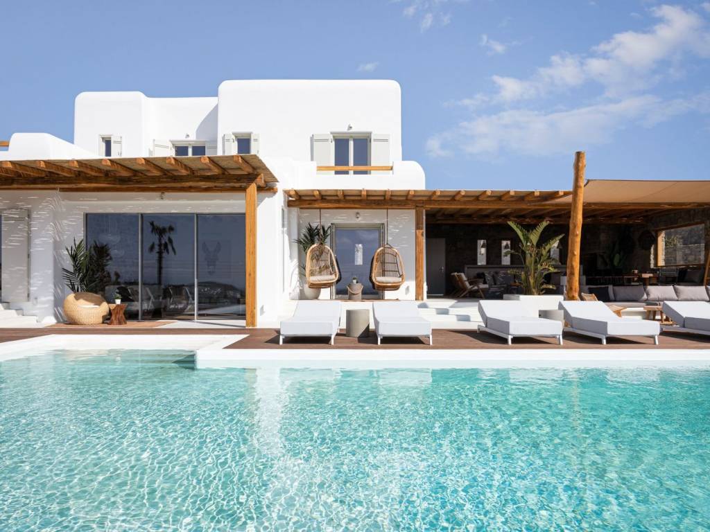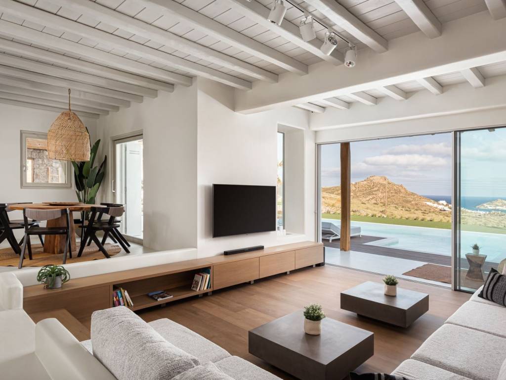 Located on a quiet hilltop just 750 meters from the sea, this villa offers clear views of Kalafatis beach and the Divounia rocks. The 250 m² house combines traditional Cycladic design with modern features, providing a comfortable and peaceful living space with sea views that stretch to the horizon. Set on a 3,200 m² plot, the villa has five bedrooms with private bathrooms, including a guest suite for added privacy. The interiors are well-designed with quality finishes and up-to-date technology for convenience and comfort. Outside, you’ll find a palm-lined infinity pool, built-in lounges, a stone BBQ area, and an outdoor dining space for ten, all positioned to enjoy the sea view. The villa is 20 minutes from Mykonos Town, making it easy to access while still offering a quiet retreat. Location: Mykonos is an island located in South Aegean and is part of Cyclades Islands. The island is one of the most developed tourist destinations in the world and is distinguished for its intense and lively nightlife. Unique Features: Mykonos is a cosmopolitan and glamorous island attracting a large number of Greek and foreign Celebrities who choose the island for their summer holidays. At the same time, characteristic features of Mykonos are its picturesque beauty that anyone can enjoy by walking in its alleys, its wonderful beaches, its luxurious hotels and restaurants. What makes it so special is the fact that it satisfies all requirements, offering visitors who love nightlife a multitude of bar options but on the other hand every visitor can discover the rich history of the island, sightseeing and archaeological sites. Accessibility: Mykonos is accessible from the port of Rafina and Piraeus, ferries depart several times a day and during the summer season at least three ferries depart in the morning and one or two in the winter. Also, Mykonos can be reached by plane as the island has an Airport with several flights operating mainly during the summer period when demand is high. Investment Opportunity: Buying property in Mykonos is a huge investment with a continuous and growing investment interest as it attracts tourists and investors from all over the world.