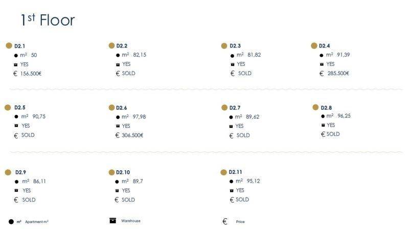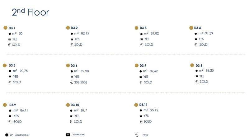 • 29 Apartments from 74.28sq.m. to 101.94sq.m., consisting of a living room with kitchen, 2 bedrooms, 1 bathroom.