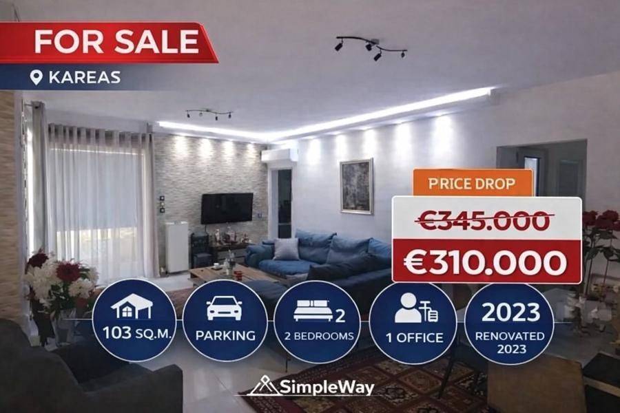 Exclusively available, Apartment 113 m2, airy, bright, in a quiet neighborhood in Karea. It consists of: Large living room, kitchen, 2 bedrooms, 1 office, 1 bathroom and 1 wc. 1 parking space in the pilothouse of the apartment building. Autonomous heating with natural gas. Large verandas front and back. There are two air conditioners in the living room and in the bedroom. There are security cameras on the balconies which detect movement and activate the alarm. It is possible to sell it furnished. House year Licensed in 1994, Year of completion 1996. It has been renovated in 2023. There is a primary school at 30m from the house and a bus stop at 50m. We speak English, Russian, French and Bulgarian.