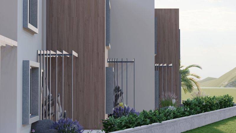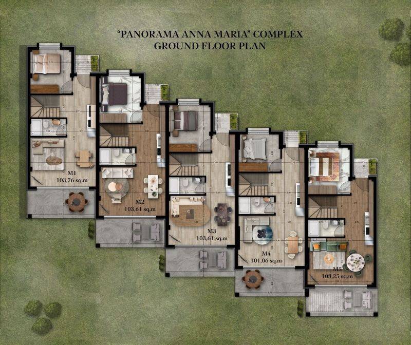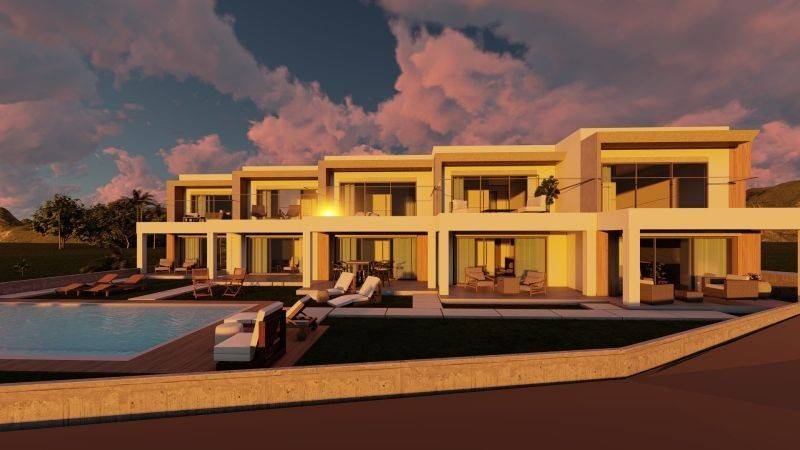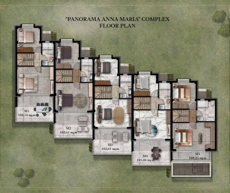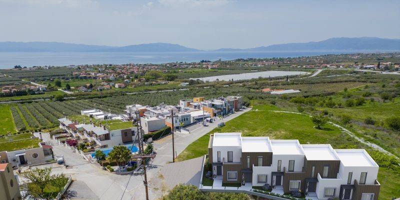 • 5 Two-story Maisonettes from 101,06 m² to 108,25 m² (living room, dining room, 3 bedrooms, 2 bathrooms. On the ground floor house there is the living room, dining room, 1 bedroom and 1 bathroom. An internal staircase leads to the first floor of the house which accommodates 2 bedrooms, 1 bathroom. The courtyard has colorful and exotic gardens surrounded by the Aegean breeze and a large communal swimming pool.