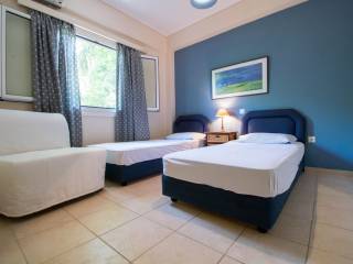 In a complex of apartments in the lovely area called Althea this ground floor approximately 75sq apartment, with beach near by is for rent. Located 20 min drive from Athens airport and 45 min from Athens is the best location for relaxed stay. The apartment has 2 bedrooms, one with two single beds and a room with a sofa bed that becomes a very comfortable double bed. The center piece is the kitchen that is connected with the living room, and from there with the garden with a nice sea view. It also offers a fully equipped kitchen with all electric appliances and essential kitchenware. And finally free parking