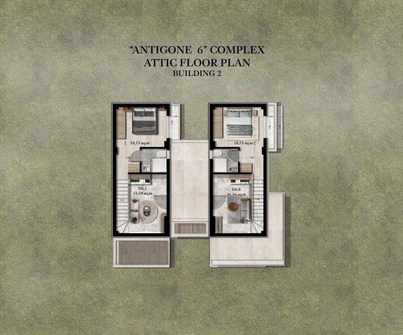• 4 Floor apartments with an attic from 54.59sq.m. to 56.56sq.m, consisting of living room with kitchen, 2 bedrooms, 2 bathrooms.