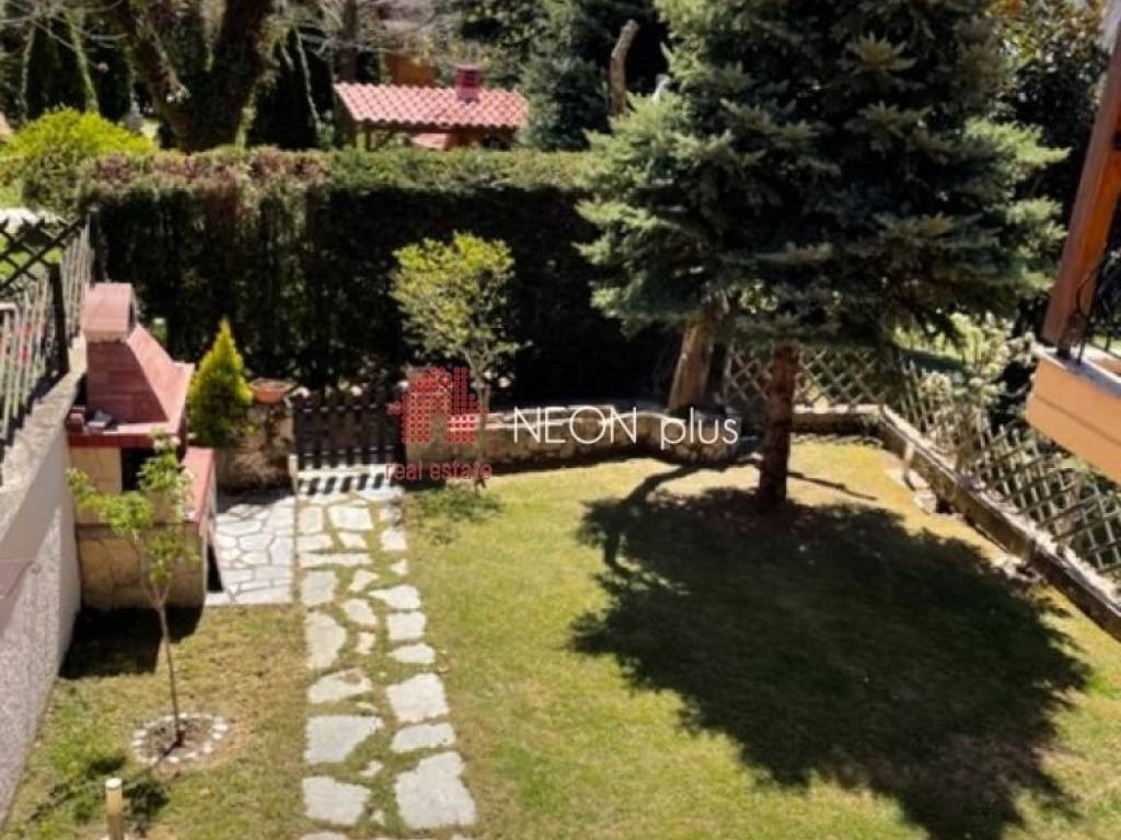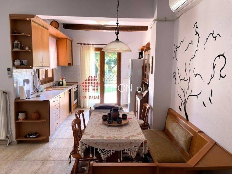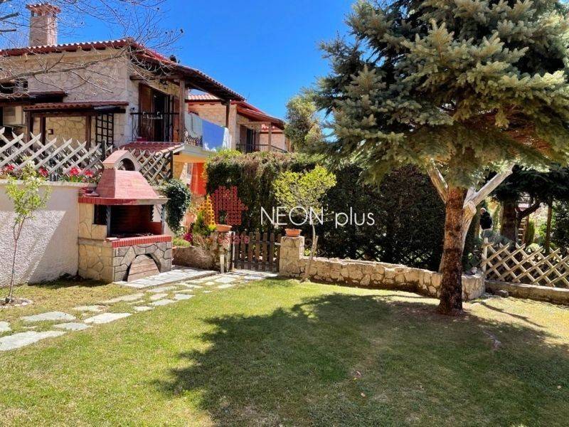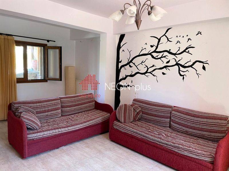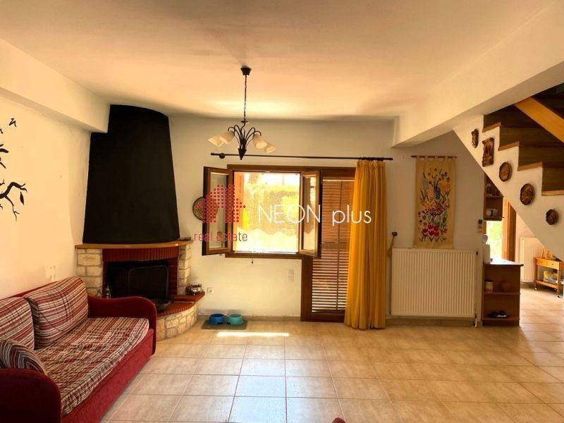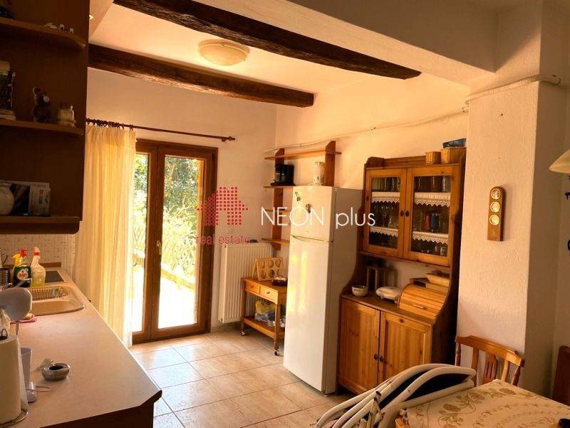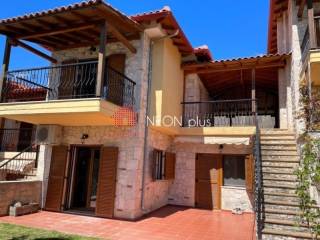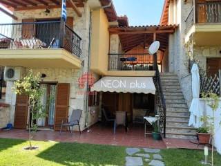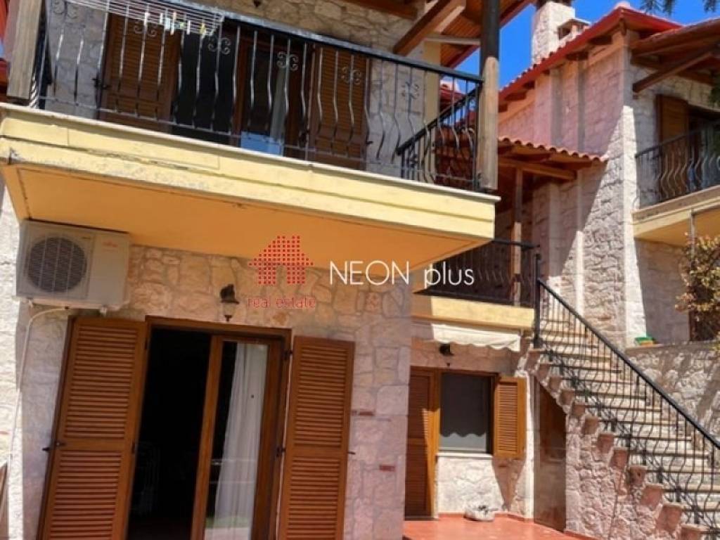 Property code: 1-505 - Poligiros Taxiarhis FOR SALE in a small distance from the village, a stone maisonette of total 104 sq.m with 2 bedrooms, living room with fireplace, kitchen, 2 bathrooms, large covered verantas and a beautiful garden. Located in a neat complex, in a greenfull enviroment. Available furnished and with electrical appliances included. - Price: 135.000 €