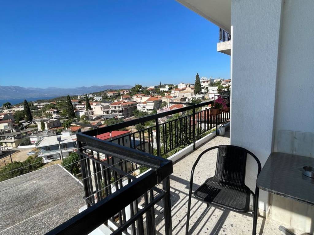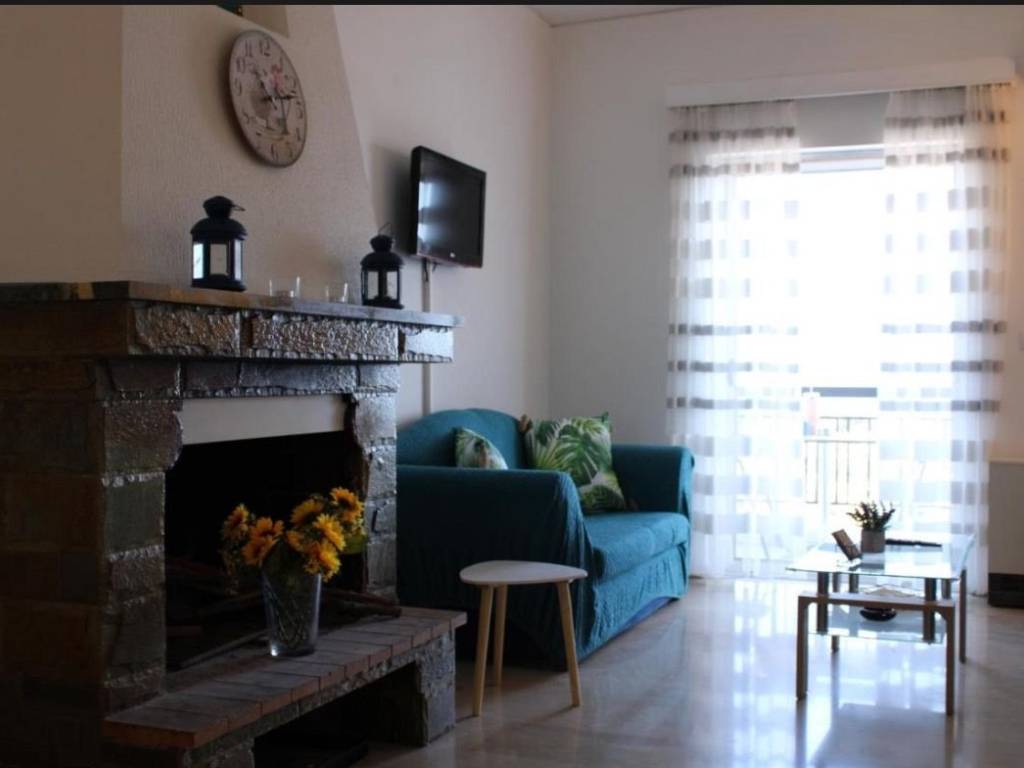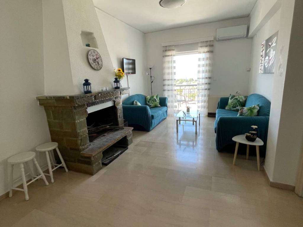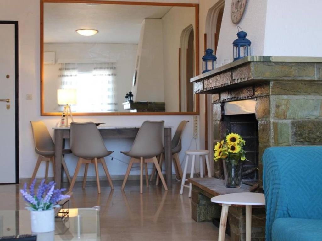 Bright apartment in Markopoulo Oropos on the 1st floor with incredible views of the Euboean Gulf and the mountain, fully furnished with new electrical appliances, two bedrooms and a smaller one with a sofa that becomes a double bed, in a quiet part of Markopoulo, ideal for a family and for anyone who wants peace and quiet and a nice environment to live in. It has a fireplace and a large storage room on the ground floor to store wood. It also has wi fi for internet connection and a large 50 inch smart tv with connection to Cosmote and Netflix