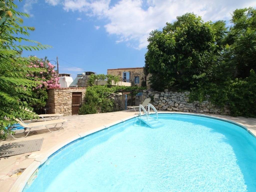 This beautiful, traditional stone cottage was completely renovated in 2004 and still contains many of it's traditional features. You enter the property through a beautiful stone arch door way with a lovely blue door. This leads you into a private courtyard with a pergola and grapevines growing to provide shade in the summer months. On your right you enter through another gate and here you will find the raised pool. Surrounding the pool, is lush growth and a full view of the White Mountains. There are stone ruins dotted around which add to the beautiful atmosphere. A small stone shed is located here in which the pool pump is kept and other storage items. The property can be entered from the kitchen or the living room. The kitchen has an old bread oven and cut out stone features in the walls. There is extra storage over head and the kitchen has been fitted with cupboards and a stove. There is plenty of space for dining inside or easy access to the courtyard for alfresco dining. Off the kitchen is a small laundry room with a toilet. Following through, you find yourself in the living area/ dining area with a wood burning stove and spiral staircase. Terracotta style tiles feature throughout downstairs and a lightly painted wooden ceiling, offering a more airy free. There is a large double bedroom located on the ground floor with an en-suite shower and toilet. The bedroom has a traditional stone arch in the middle of the room and a skylight. Upstairs there is another bathroom with a bath and an external door leading from the hall way to a terrace area. The views are spectacular, looking over the courtyard, pool area and mountain views. The terrace has plenty of space for entertaining and enjoying sunset views on summer nights. The second bedroom has high wooden ceilings and another external door leads to another terrrace on the other side of the house. This time you enjoy views down the valley, over Almyrida and out to sea. This property has air conditioning in both bedrooms and a wood stove for the cooler evenings. The plot size is 322m² and there is an additional 96m² located outside the property for parking the car. The house comes fully furnished completed with white goods, indoor and outdoor furniture, linen, cutlery etc. This property is very unique and located in a peaceful location. Aspro village has lots of history and Almyrida is only a short drive to the mini markets, beach and tavernas.